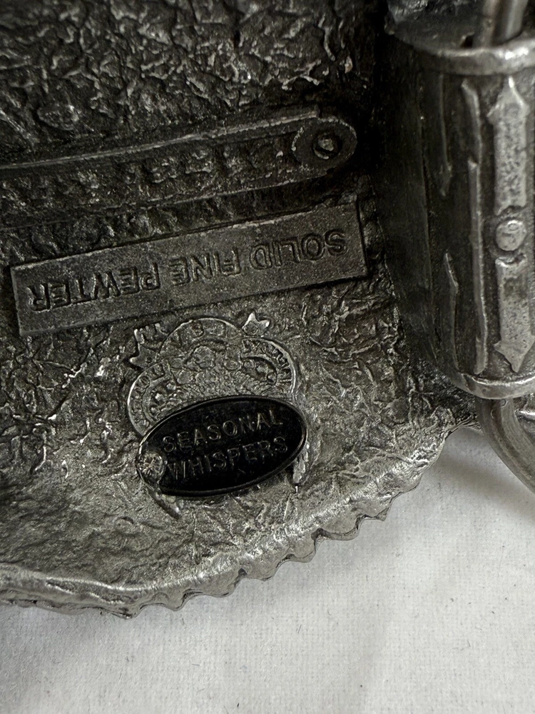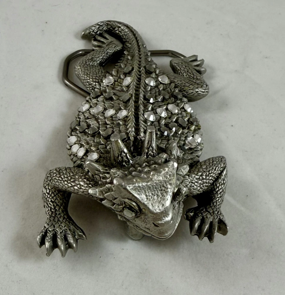 Add a touch of uniqueness to your wardrobe with this Seasonal Whispers #4484 Horned Lizzard belt Buckle. The intricately designed buckle is perfect for those who love to make a statement with their fashion choices. Made by a trusted brand, this buckle is sure to last for years to come. This versatile buckle can be paired with any outfit, making it a must-have accessory for any fashion-forward individual. Whether you're dressing up for a night out or looking to add some flair to your everyday look, this buckle is the perfect choice. Seasonal Whispers Belt Buckle in great shape!