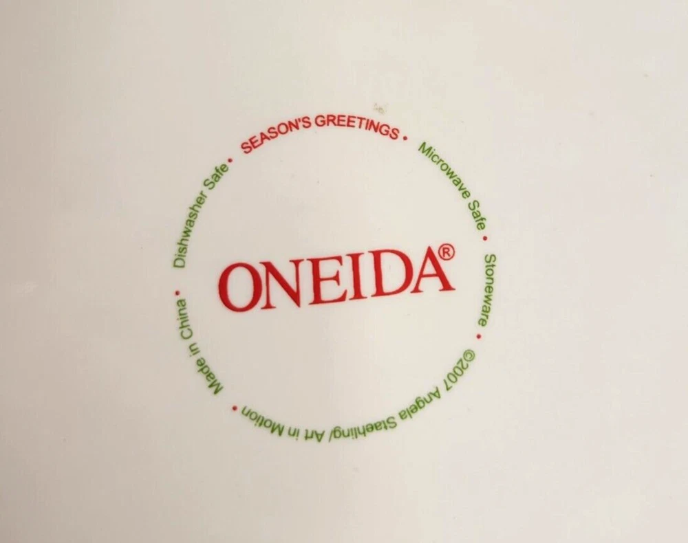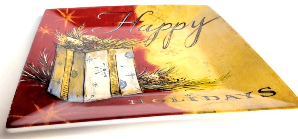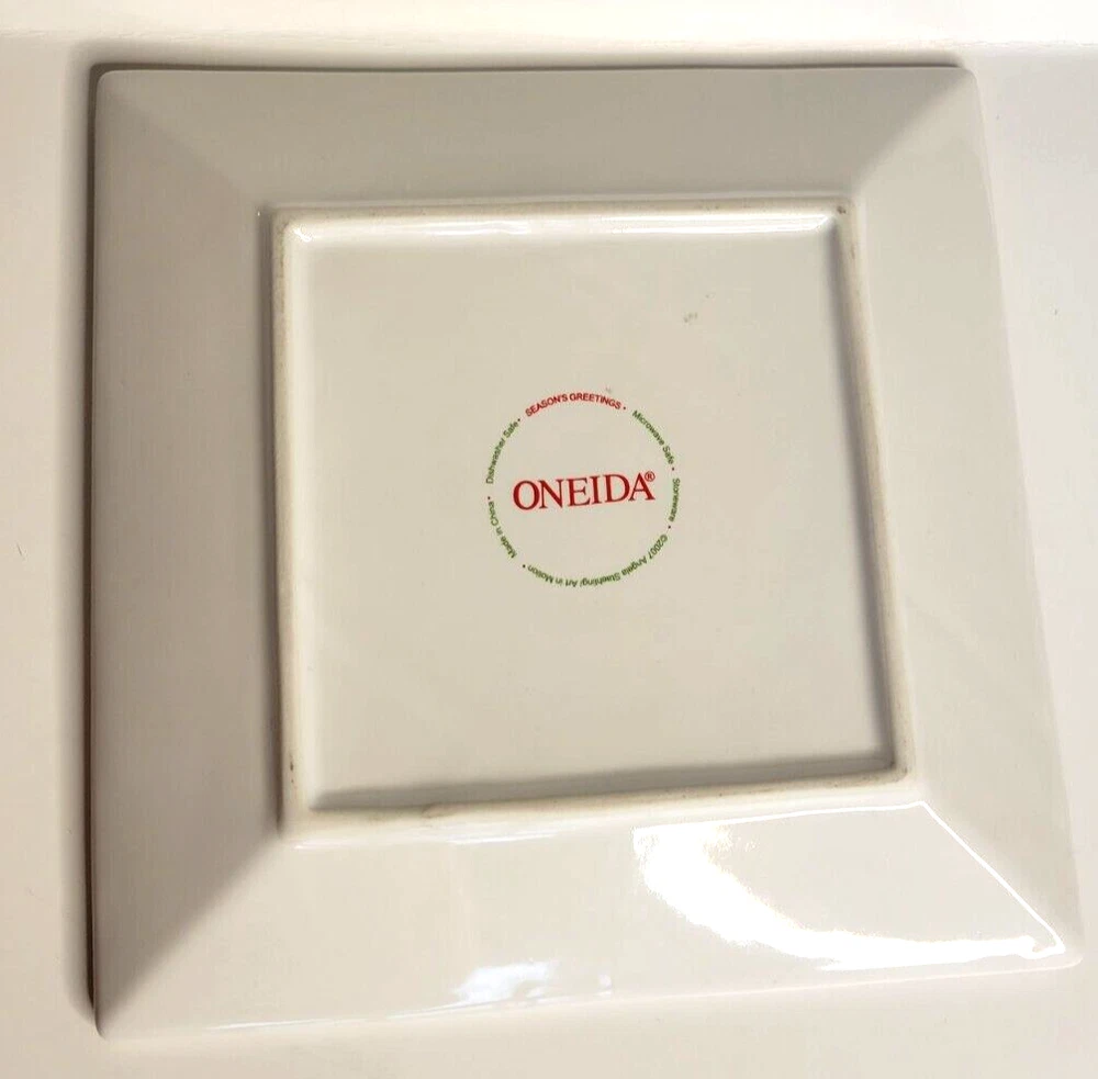Oneida Seasons Greetings 8x8 square stoneware salad plate. Reads "Happy Holidays" with gift bag, pine greenery and stars. Red & Golden Yellow. Dishwasher and microwave safe. Made in 2007. No chips or cracks.