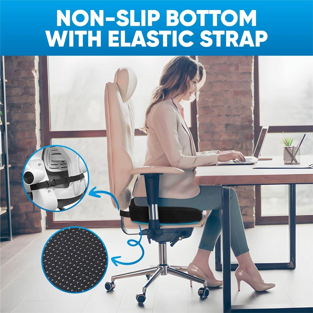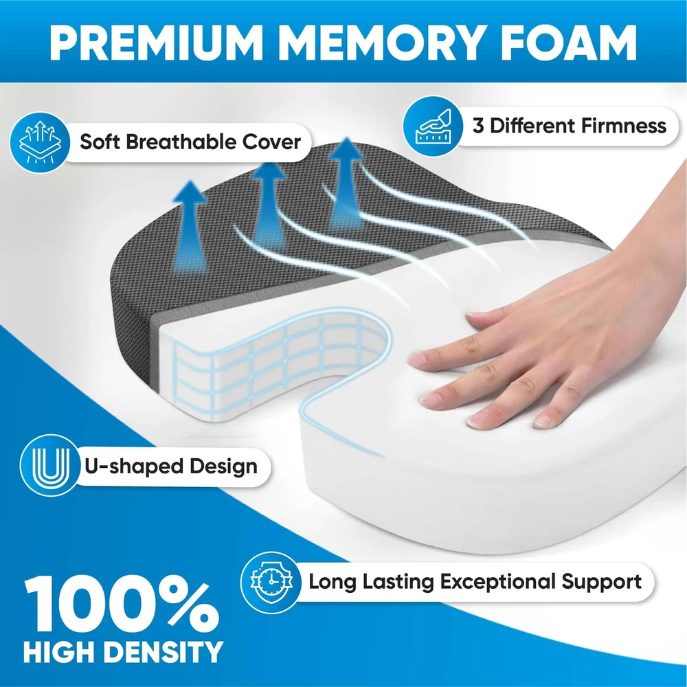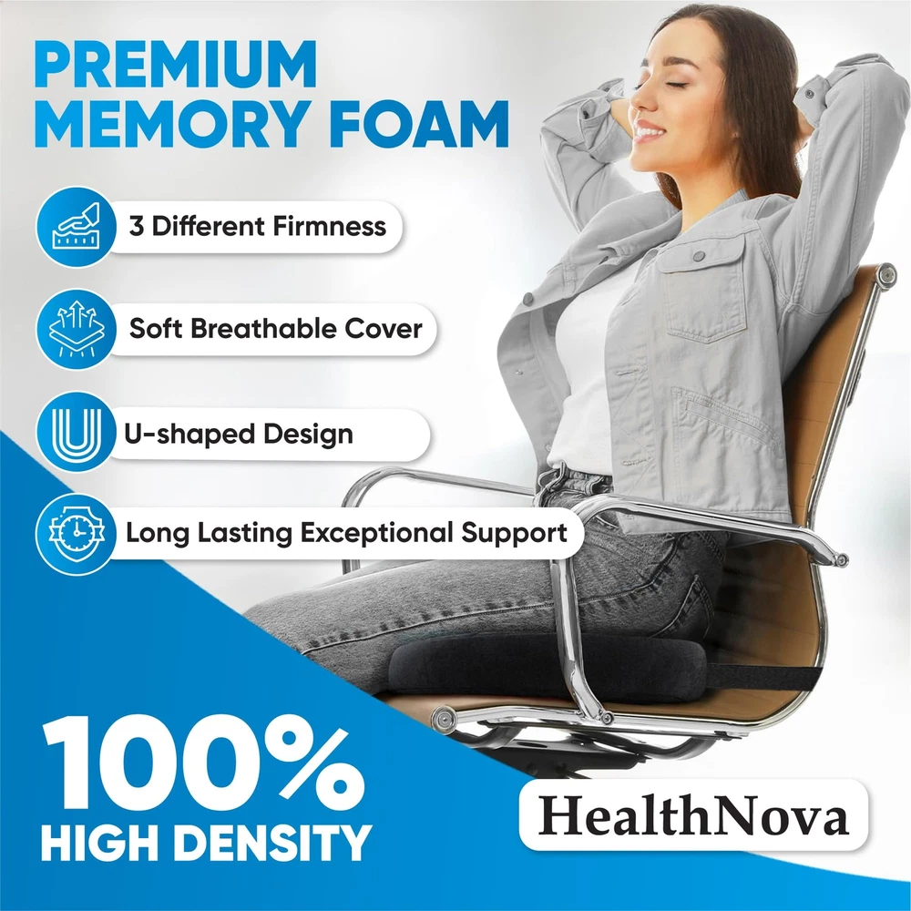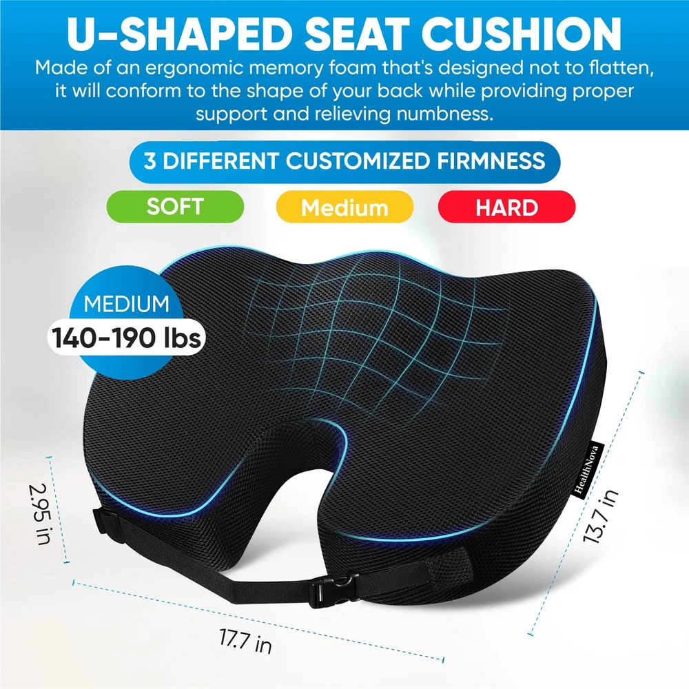 U-Shaped Seat Cushion: Featuring an ergonomic U-shape that conforms to your anatomy, this seat cushion for tailbone pain relief is designed for your comfort. It provides excellent support for the tailbone, sciatica, and hips while relieving pressure off the coccyx and promoting a comfortable sitting position without pain! Memory Foam Core with Soft Cover: These seat cushions for office chairs feature a high-end construction made with high-density memory foam, whose excellent rebound and optimal firmness provide cushioning and support in all the right places. The soft, breathable cover offers comfort and it’s removable and easy to wash. Customized Firmness: Unlike other similar products, our memory foam seat cushion is available in multiple firmness options (soft, medium and hard). Choose the firmness level depending on your weight to ensure optimal support and comfort. Anti-Slip Bottom with Straps: Featuring an anti-slip bottom and adjustable straps, the memory foam seat cushion for chair redefines sitting! Simple and effective, our orthopedic cushions ensure a secure hold, do not slip with ease and allow you to focus on your tasks without constantly rearranging your pillow! Versatile Use: Thanks to their excellent firmness and unmatched support, our seat cushions for pressure relief can be used on your desk chair, office chair, dining table chair, car seat or sofa, to help you feel comfortable during everyday activities.