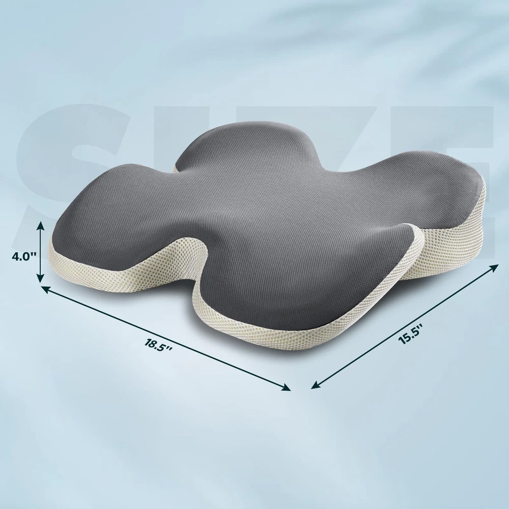 【Our Cushion Designed for U】patented contoured double "U" cut-out memory foam seat cushion is ergonomically designed to accommodate your body curve, keeps hips and tailbone away from hard sitting surfaces to release pressure on your lower body. Provides effective hip, leg, thigh support for all-day sitting comfort, improves sitting posture, and helps reduce tailbone, coccyx, sciatic pain 【Premium Material】Our sciatica pain relief pillow adopts molded slow rebound memory foam that is helpful for distributing your weight evenly; Includes a detachable and machine washable cover that is made of skin-friendly and wear-resistant polyester fabric on top, breathable mesh on the sides, and black anti-skid fabric bottom to ensure the cushion keeps stable in a seat 【Enjoy Comfort Anywhere】 Measures 18.5" x 15.5" x 4.0", our tailbone pressure relief seat cushion fits most chairs, and can be used as chair cushions for office desks, computer and gaming chairs, dining chairs, or car, truck, train, airplane, travel, stadium, bleacher, wheelchairs seat cushions, etc. It's a chair pad that suits everyone, including office workers, long-time drivers, pregnant women, teachers, students, the elderly, people need wheelchair, etc 【Ideal Gift for The One】Our pressure relief seat cushion is an ideal gift for the elderly, families, partners, teachers, or friends on Birthday, Mother's Day, Father's Day, Valentine's Day, Thanksgiving Day, Christmas Day, Housewarming gift, etc 【After-Sales Service】If you have any questions about the office chair cushions, please feel free to contact us; You can also search "memory foam lumbar pillow" in the store to find the matching back support; [WARM TIPs]: For your health, please take 5-10 minutes to get up and move after 1 hour of continuous work