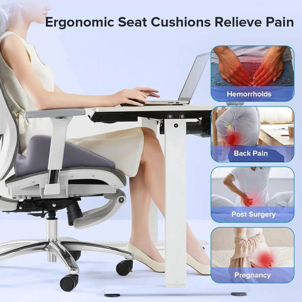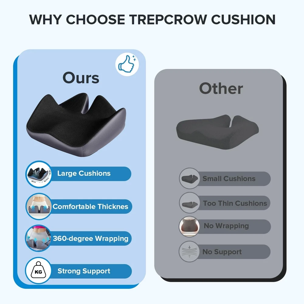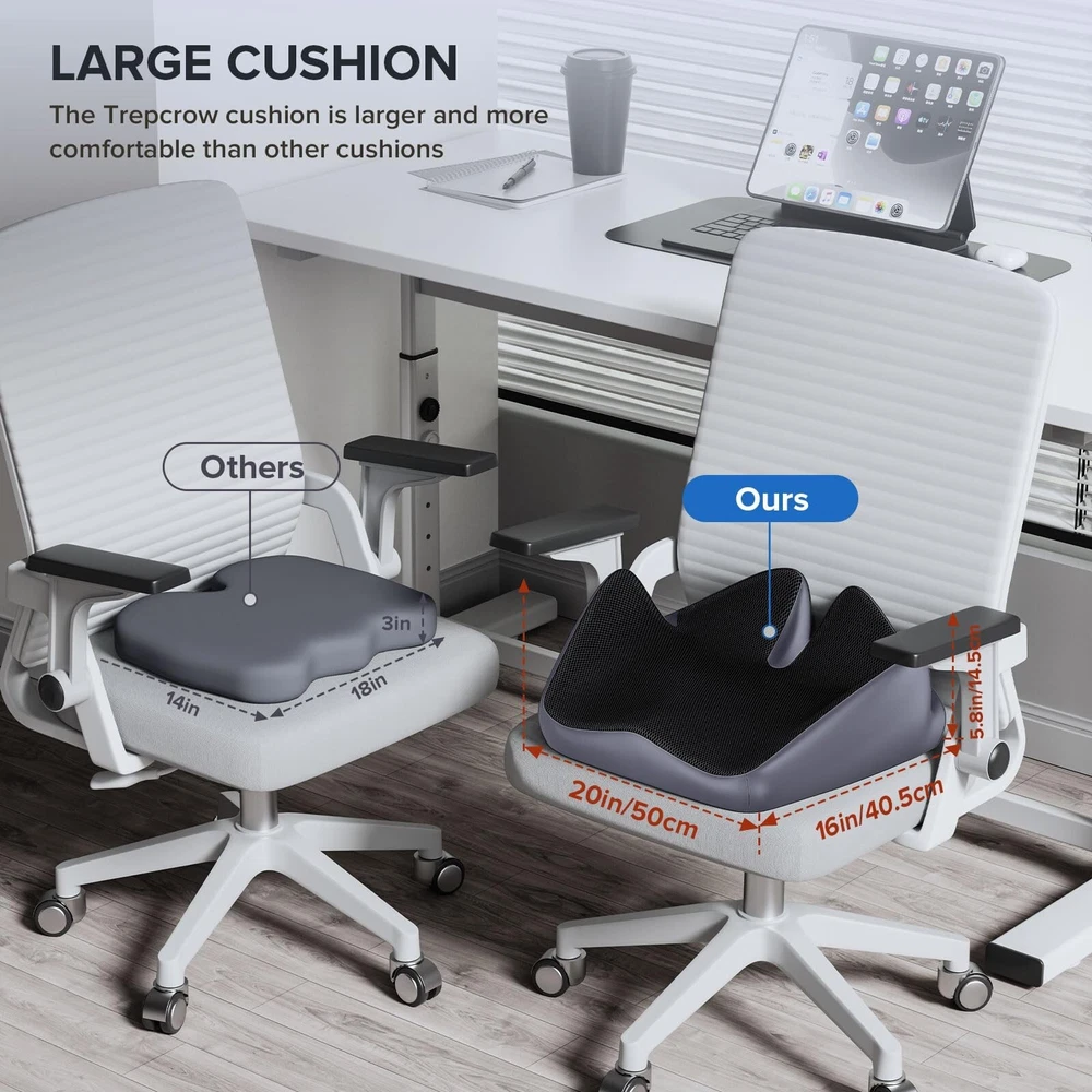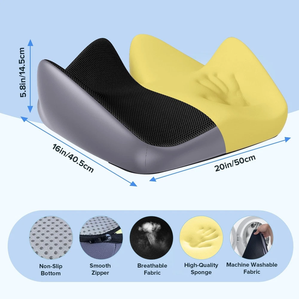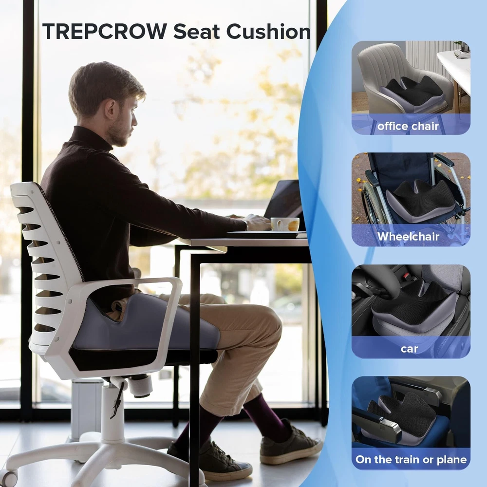 Seat Cushion for Relief Sciatica - Memory Foam Cushion for Office Chair, Hip & Coccyx Pain Relief for Long Sitting,2024 Upgraded Large Seat Cushion for Soft Support,Suitable for Game Chair/Wheelchair Product Details Size: 20*16*5.8 Brand: Trepcrow MPN: L Seat Cushion UPC: 764015538629 EAN: 0764015538629 Brand: Trepcrow Special Feature: Rnique Design,Removable Cover, Color: Black Size: 20*16*5.8 Fill Material: Memory Foam Brand: Trepcrow Special Feature: Rnique Design,Removable Cover, Color: Black Size: 20*16*5.8 Fill Material: Memory Foam Shape: Special Shape Age Range (Description): Adult Recommended Uses For Product: Sitting Use for: Hip Material: Memory Foam Item Firmness Description: Medium Soft Product Dimensions: 20"L x 16"W x 5.8"H Product Care Instructions: Remove the Cushion Cover by Unzipping the Underside of the Front of the Cushion. The Cover Can be Hand or Machine Washed. Do Not Put Memory Foam in the Washing Machine or Dryer. Number of Pieces: 1 Pattern: Plaid Item Weight: 1.78 Pounds Material Feature: Breathable, High Dense Memory Foam, Durable Zip, Premium Memory Foam. Variety: Memory Foam,Seat Cushion Fabric Type: Breathable Mesh Model Name: L Seat Cushion Specific Uses For Product: Office Chair, Car, Van, Bus, Truck, Yoga, Wheelchair, Airplane, Outdoor, Gaming Chair UPC: 764015538636 764015538629 764015538520 Manufacturer: TASPGE Product Dimensions: 20"L x 16"W Unit Count: 1.0 Count Item Weight: 1.78 pounds Country of Origin: China Item model number: L Seat Cushion Date First Available: December 13, 2023 Versatile Pressure Relief Cushion - Our seat cushion is ergonomically designed to fully envelop the adult seat cushions. With three major zones for sitting, including leg, hip, and coccyx support, it effectively relieves sciatica, coccyx pain, leg pain, and lower back pain.If for some reason our cushions do not fit your seat, just contact us and we will address your issue within 24 hours. High-Quality Memory Foam Office Cushions - Our office chair cushion are made of 100% pure memory foam, which is soft yet firm, providing slow rebound "zero pressure" support. They have undergone professional safety testing, ensuring flexibility and no deformation after repeated use. Designed for Comfort - The unique tail support increases height by 5.8IN, relieving pressure on the tail, enhancing coccyx support; raising both sides by 5.8IN to support the buttocks for a relaxed shaping, avoiding hip sagging caused by long periods of sitting; The W-shaped design ensures natural relaxation of the legs without numbness or discomfort, hip collapse caused by sitting for a long time. Multiple Uses Seat Cushion - This tailbone pain relief cushion fits most types of chairs, Suitable for most office chairs, car seats, home chairs, gaming chairs, wheelchairs, our pressure relief seat cushion is generously sized (20x16x5.8IN) and thick enough to support adults weighing between 100-220 pounds. Convenience - Covered in non-slip silicone particles on the bottom, our desk chair cushion stays firmly in place for added stability. The breathable cover is washable for easy maintenance, setting a new standard for health and hygiene. Practical Gift - Suitable for people of all ages, it can be used in dormitories, offices, computers desk, bedrooms, etc. A amazing birthday or holiday present for family, friends, workmates, grandparent and teenagers.
