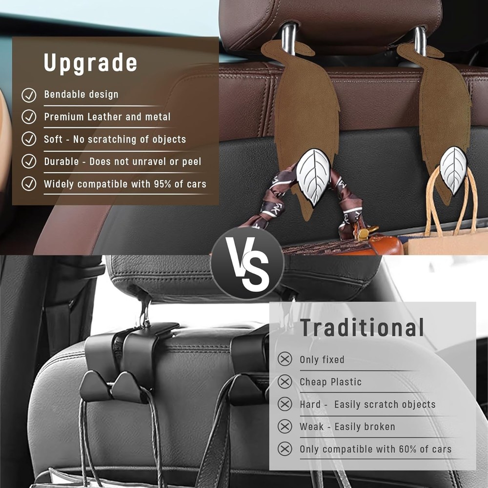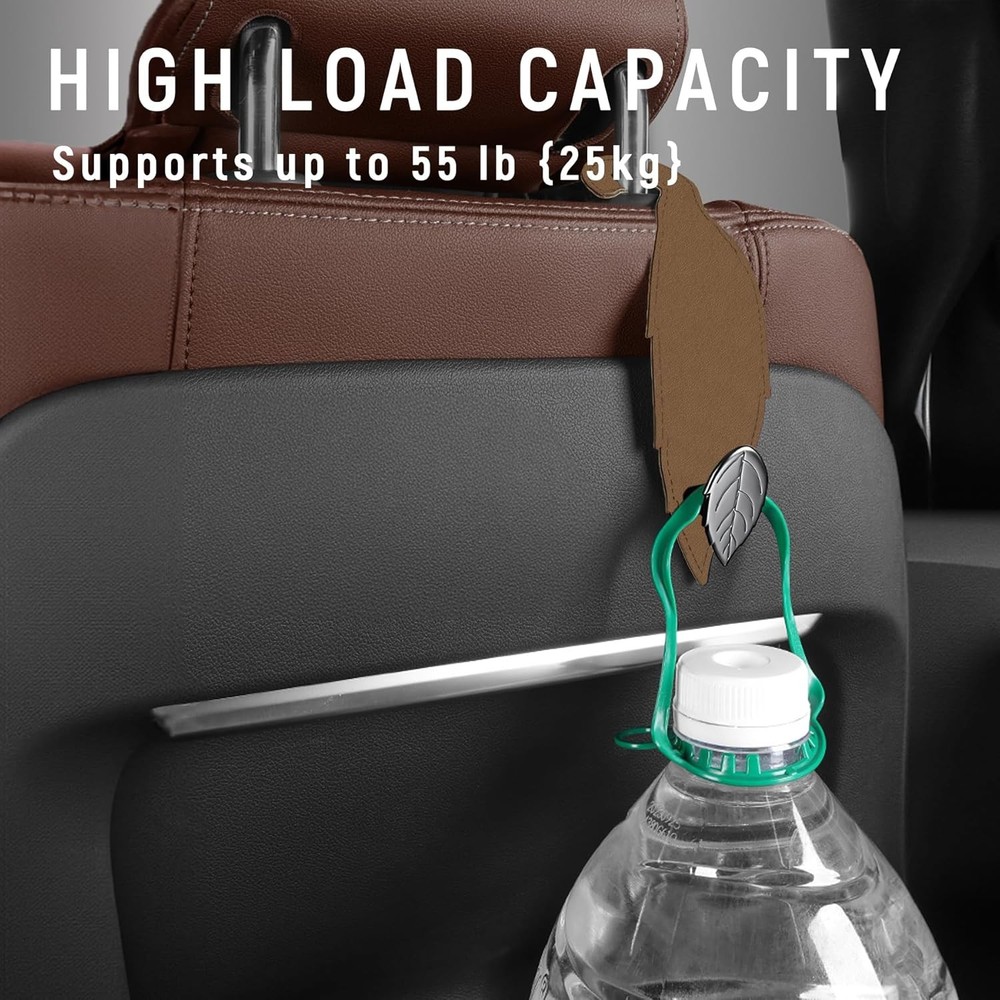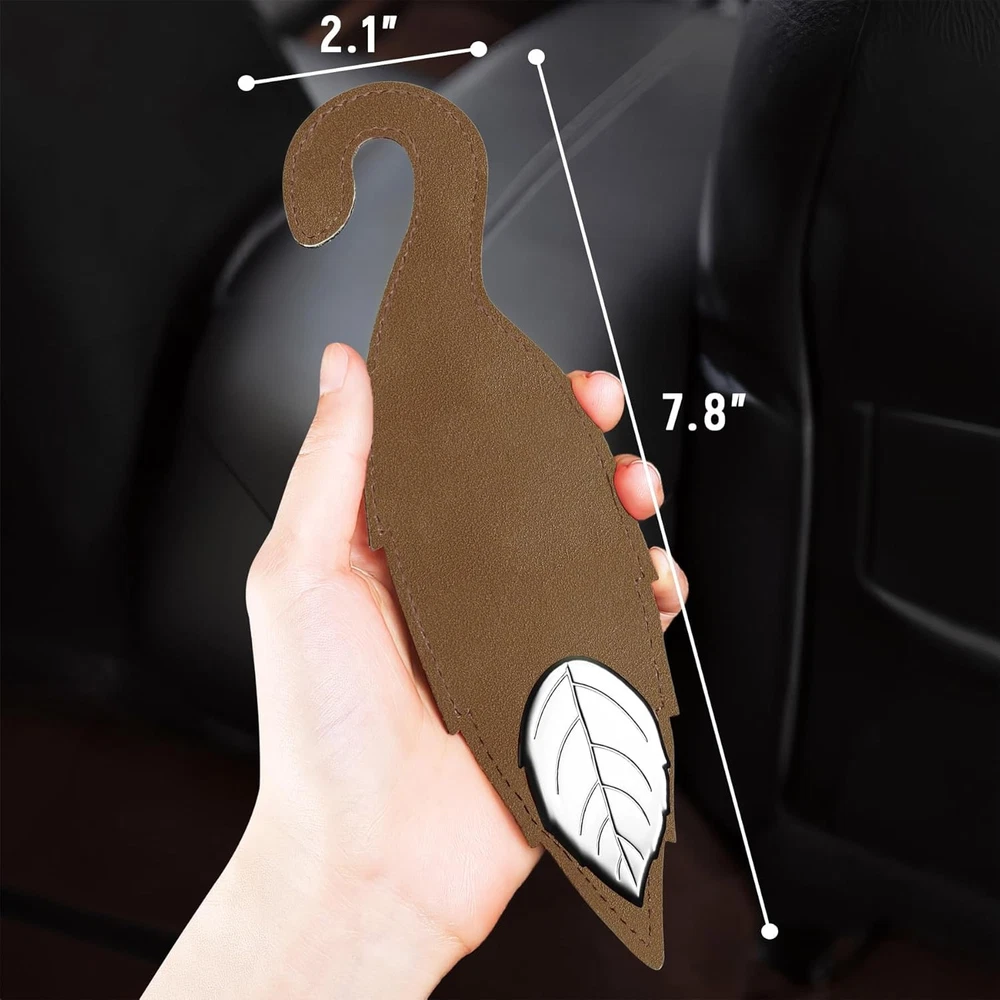About this item [CREATE EXTRA SPACE] - This car seat hook is the perfect companion for leather seats. It's designed to hang wallets, bags, and more without taking up a bit of your passenger seat. [NOVEL DESIGN] - The exterior design is inspired by leaves, adding a touch of nature to your car while solving your car's interior arrangement. This car seat headrest hook is stronger and classier than plastic hooks, with flexible straps that hug the seat contours for a snug fit. [EXCELLENT QUALITY] - Made from top-grade leather, sturdy and durable. No more worrying about damage to your seats; this seat back organizer is designed to be kind to your upholstery while maximizing your storage space. Each hook can hold up to 55 lb (25 kg), which will meet your daily use. [EASY TO INSTALL] - No tools needed! Just attach the hooks to your car’s headrest columns. They’re cleverly designed to flip backward for the driver’s side and forward for the passenger’s side. Say farewell to your belongings rolling around on the floor. [WIDE APPLICATION] - This car storage hanger is designed to work with any vehicle, making it the go-to storage solution for every driver. Turn wasted space into storage space for groceries, handbags, bags, purses, schoolbags, umbrellas, water bottles, shopping bags, pocketbooks, and more. Package Dimensions: 7.8 x 3.9 x 0.6 inches.