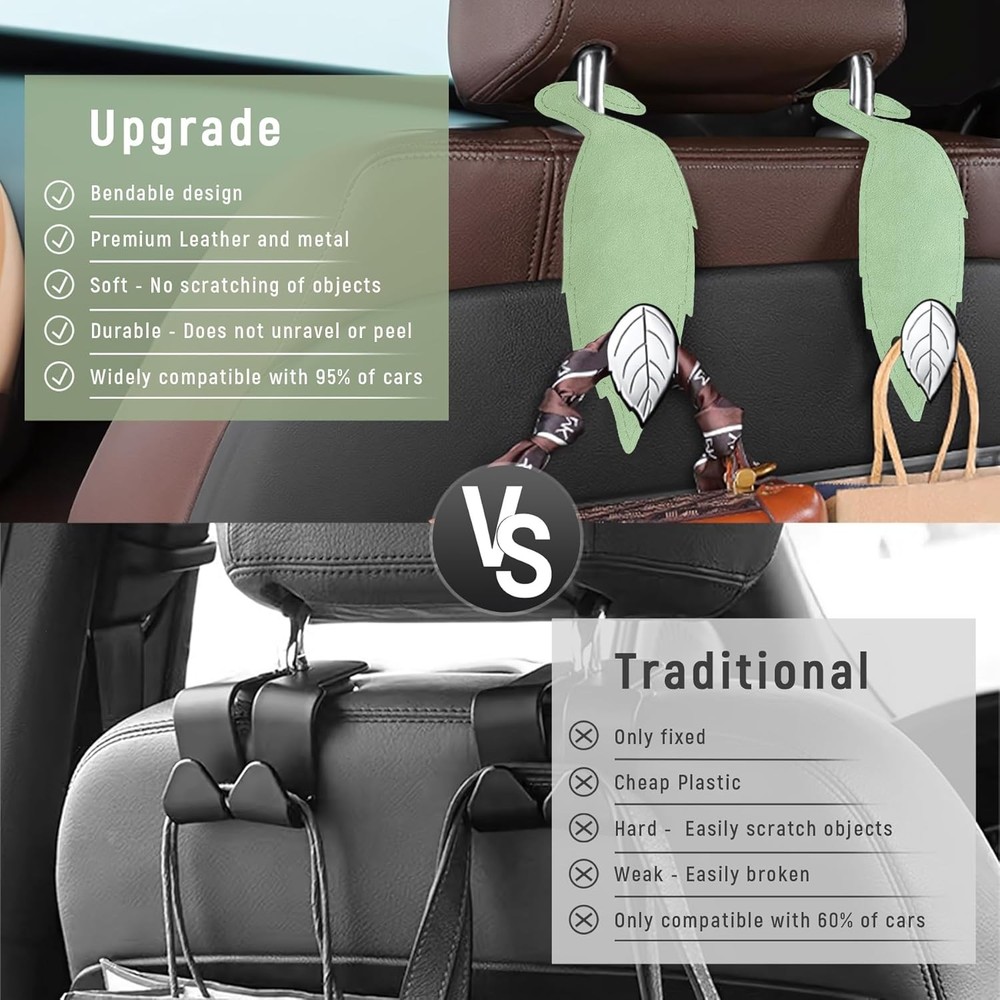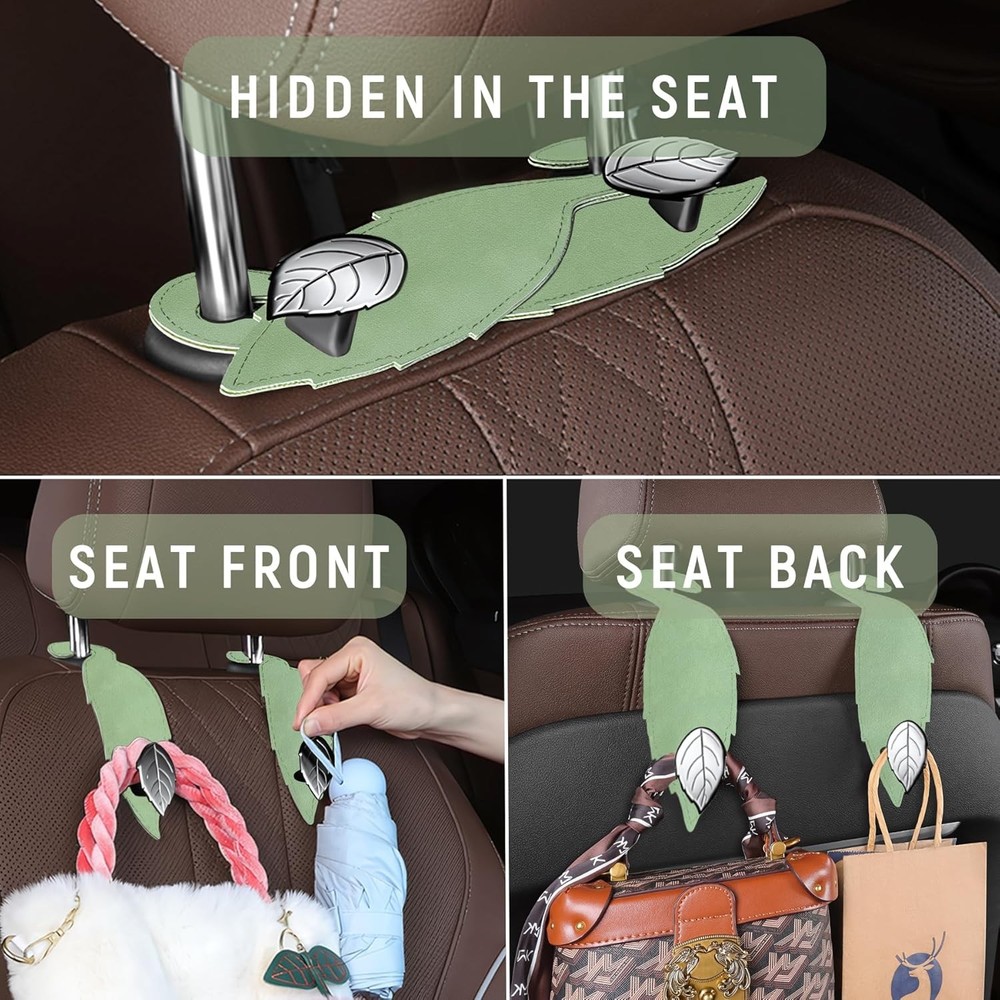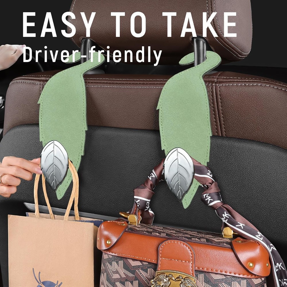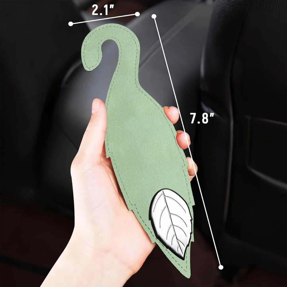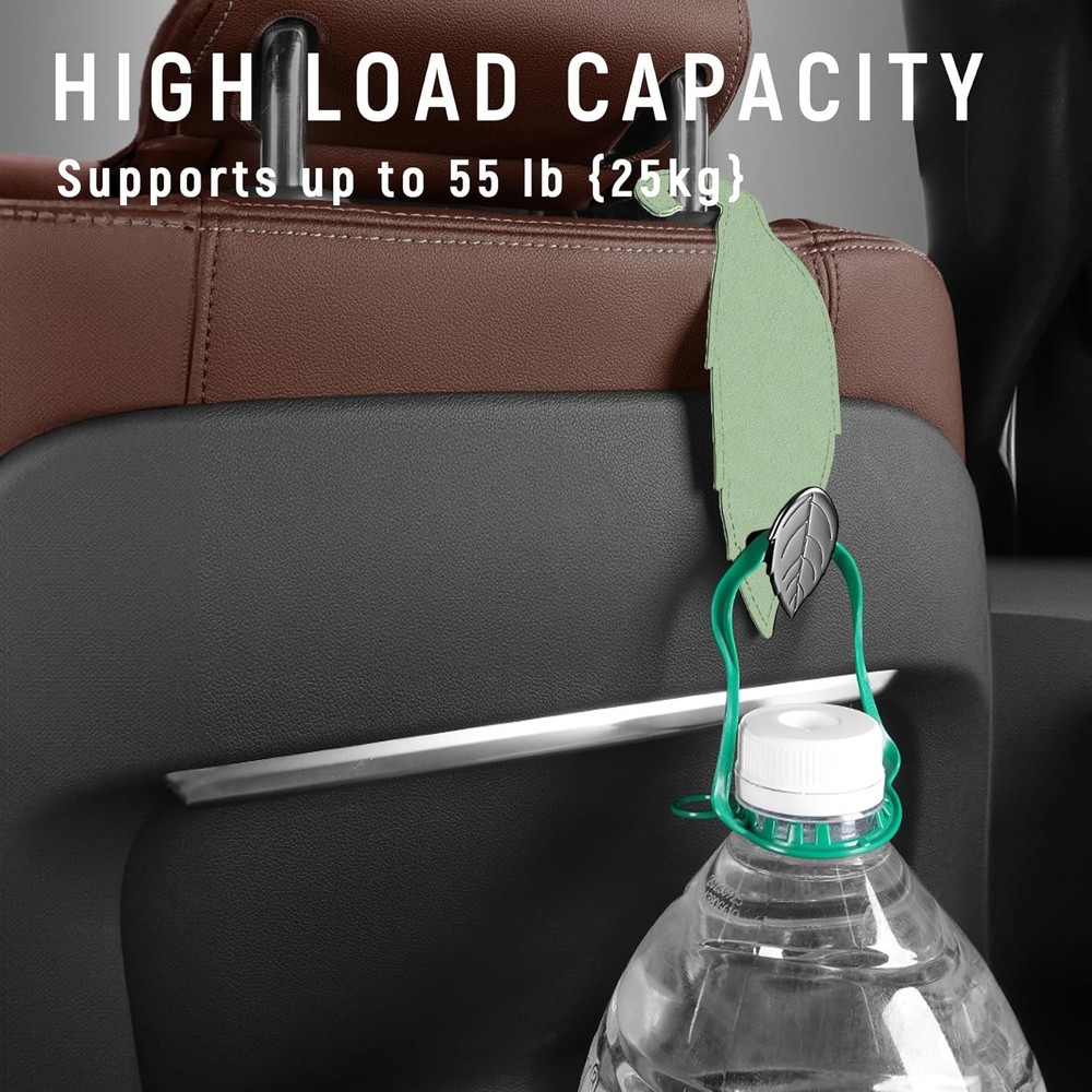 About this item [CREATE EXTRA SPACE] - The car seat hook is the perfect companion for your leather seats. It's designed to hang wallets, bags, and more without taking up any space on your passenger seat. [NOVEL DESIGN] - The exterior design is inspired by leaves, adding a touch of nature to your car while solving your car's interior arrangement. This car seat headrest hook is stronger and classier than plastic hooks, with flexible straps that hug the seat contours for a snug fit. [EXCELLENT QUALITY] - Made from top-grade leather, sturdy and durable. No more worrying about damage to your seats; this seat back organizer is designed to be kind to your upholstery while maximizing your storage space. Each hook can hold up to 55 lb (25 kg), meeting your daily use requirements. [EASY TO INSTALL] - No tools needed! Just attach the hooks to your car’s headrest columns. They’re cleverly designed to flip backward for the driver’s side and forward for the passenger’s side. Say farewell to belongings rolling around on the floor. [WIDE APPLICATION] - One Package Dimensions fits all – this car storage hanger is designed to work with any vehicle, making it the go-to storage solution for every driver. Turn wasted space into storage space for groceries, handbags, bags, purses, schoolbags, umbrellas, water bottles, shopping bags, pocketbooks, and more. Package Dimensions: 7.8 x 3.9 x 0.6 inches.
