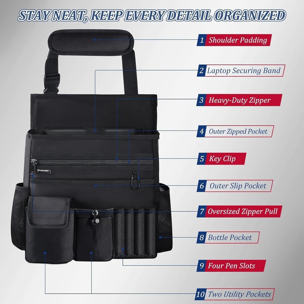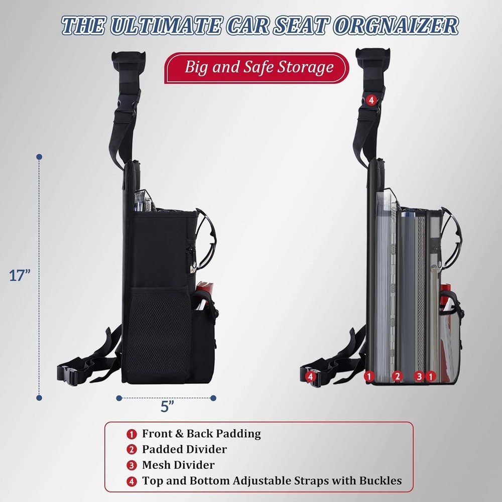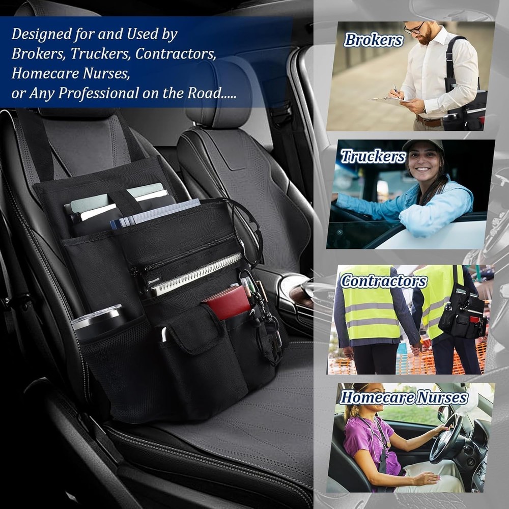 Stay Organized on the Road: This car seat organizer keeps your vehicle tidy with essentials close at hand. Perfect for project coordinators, truckers, brokers, and other on-the-go professionals who spend long hours on the road! Large Storage Space: Features a 17" x 5" padded section for laptops up to 18", space for up to 3 ring binders with a mesh divider, and a zippered pocket for important documents. Also includes an outer slip pocket, 2 bottle holders, 2 small utility pockets, and 4 pen slots. An ideal addition to your car accessories collection for an organized ride! Built to Last with Convenience: Constructed from durable 600D fabric with 1.5" tough straps, a heavy-duty zipper, and a reinforced padded back, this truck organizer offers superior durability and structural integrity. The extra-large zipper pull provides quick access to valued items easily, making it a reliable part of your truck accessories! Ultimate Versatility Car Organizer: Two adjustable straps with hardened buckles ensure secure stability, allowing it to serve as a passenger or back seat organizer without sagging. Easily converts into a shoulder-carrying bag when needed, the best choice for flexible use on and the road! Make Your Ride Smoother and Safer: Designed to keep everything organized and within reach, this versatile car organizer helps you stay focused on the road. Enjoy a clutter-free, stress-free journey with essentials securely stored and easily accessible!