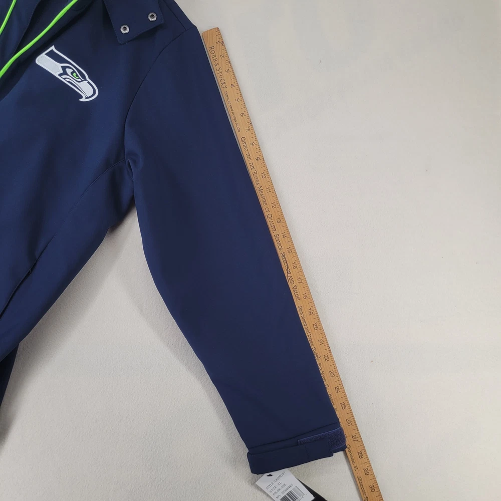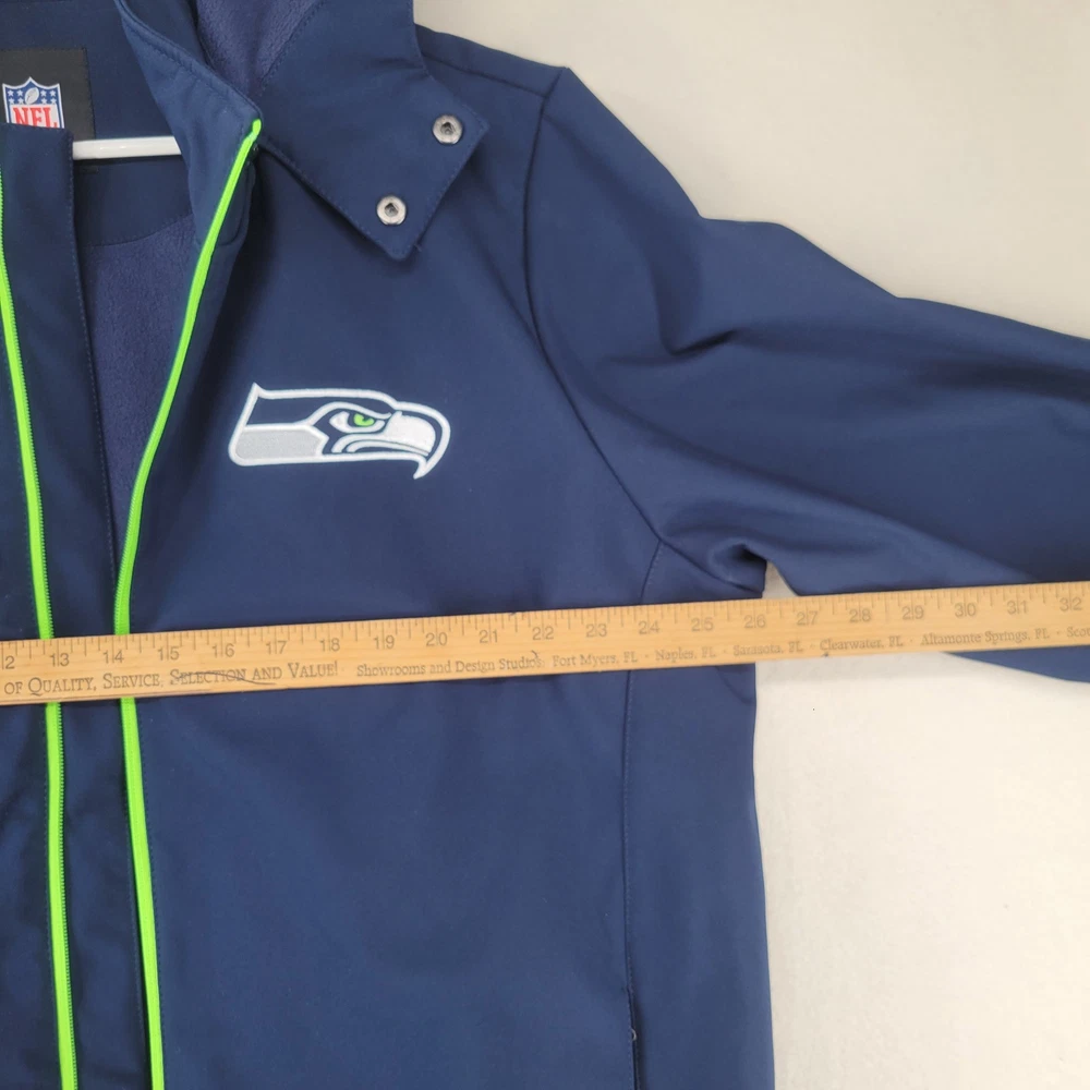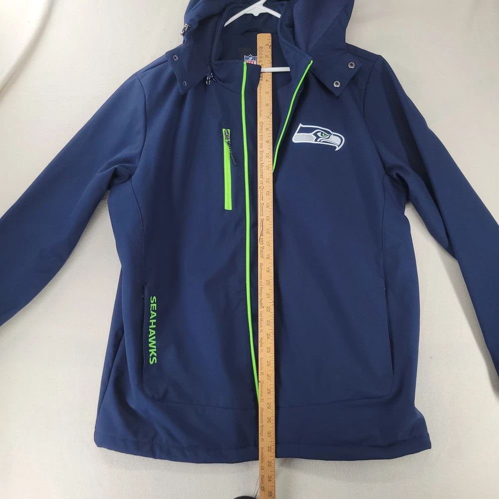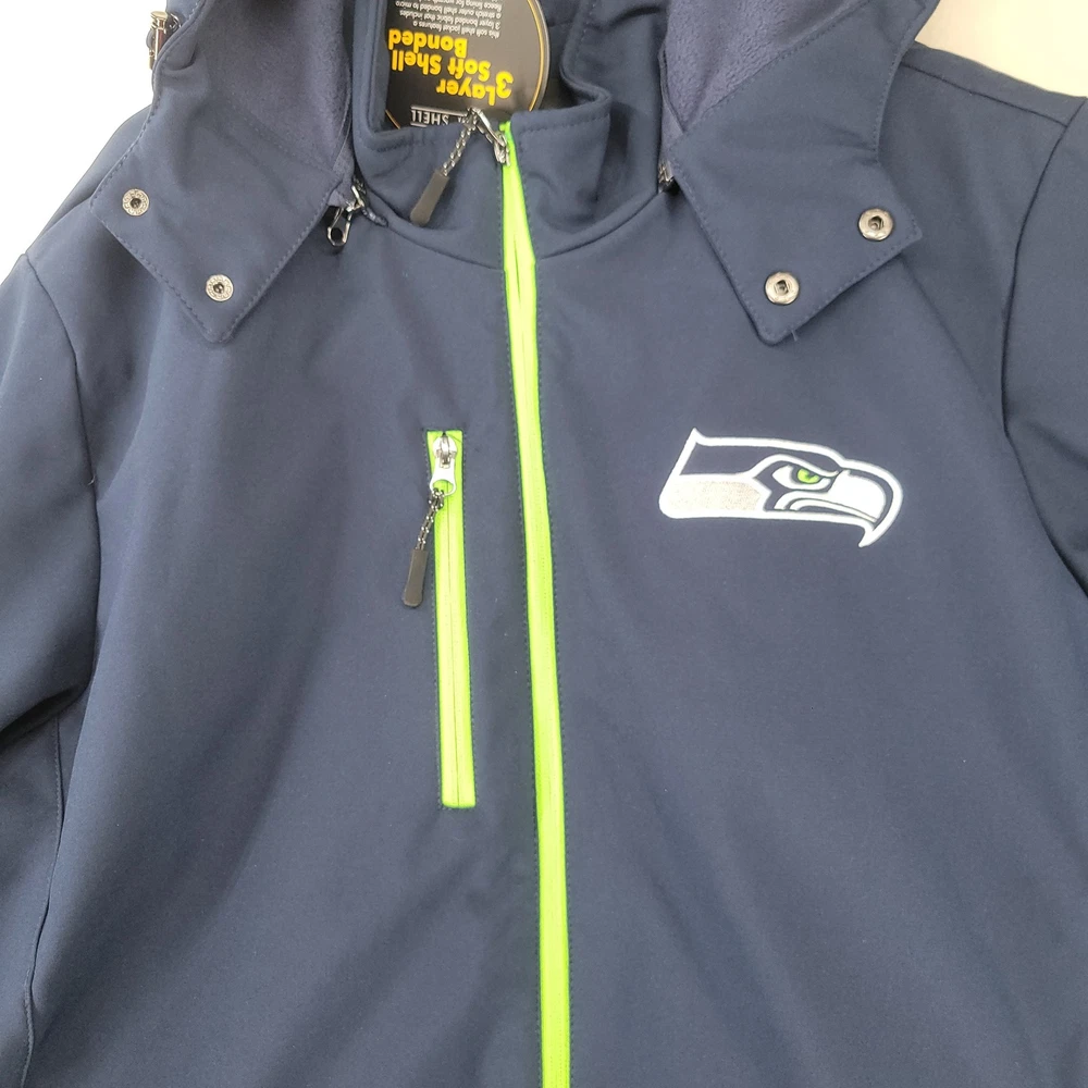 Seattle Seahawks Jacket Mens XL Blue NFL Football Soft Shell Hooded Waterproof Condition: Brand New with Tags This officially licensed NFL Seattle Seahawks soft shell jacket features a 3-layer bonded fabric construction for superior warmth, comfort, and weather protection. The jacket outer layer is water-resistant, with a micro fleece lining and a wind- and water-resistant breathable membrane film insert between. Features an embroidered Seattle Seahawks logo on chest, "SEAHAWKS" text detailing on the lower left, and contrast vibrant neon green zipper details. Hooded design with snap collar, full zip front, zippered chest pocket, and two zip hand pockets. -adjustable cuffs for a custom fit. Shell: Water-resistant outer shell with micro fleece lining Color: Navy blue with neon green accents Size: XL (Mens) Official NFL shield logo on inner neck tag, made in China Approximate measurements: Pit to pit 26", length 31", sleeve length 27" Perfect for layering at games, tailgates, or everyday NFL fan wear