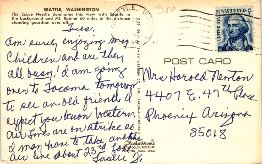 MAKE AN OFFER. THE MORE YOU BUY THE BETTER DEAL I WILL ACCEPT The front of the postcard features a view of Seattle, Washington, with the Space Needle in the foreground, the city in the background, and Mt. Rainier visible 60 miles away. The Space Needle is an iconic landmark in Seattle, built for the 1962 World's Fair. Mt.