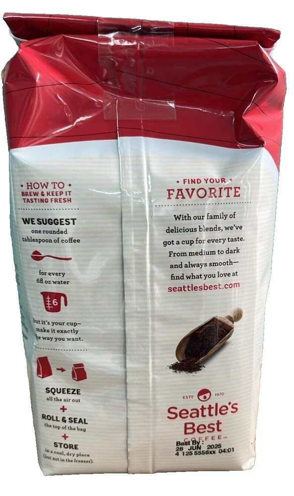 Brand:Seattle's Best CoffeeRegional Cuisine/Region:Does not applyGrind:MediumLabels & Certifications:Appellation d'origine contrôlée (AOC)Product:Ground CoffeeNumber in Pack:12Style:CoffeeCalories per Serving:Less Than 50Expiration Date:Jun 2025Product Name:Does not applyUPC:0012919122124Course:Does not applyItem Weight:12 ozFood Specifications:Caffeine Free, Organic, Gluten Free, Kosher, Sugar FreeCalories per 100 g/mL:RegularFood Aisle:Does not applyRoast:DarkServing Size:40 GramsNumber of Servings:Does not applygtin13:0012919122124Country/Region of Manufacture:Does not apply
