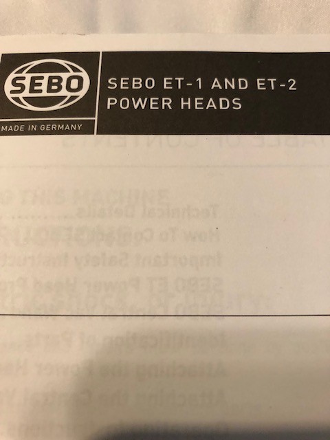Sebo Vacuum ET-1 and ET-2 owner's manual booklet for Powerhead / Power Nozzle Owner's Manual Only
