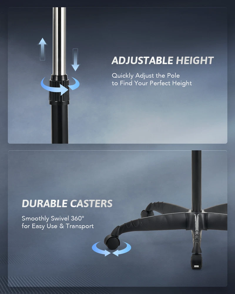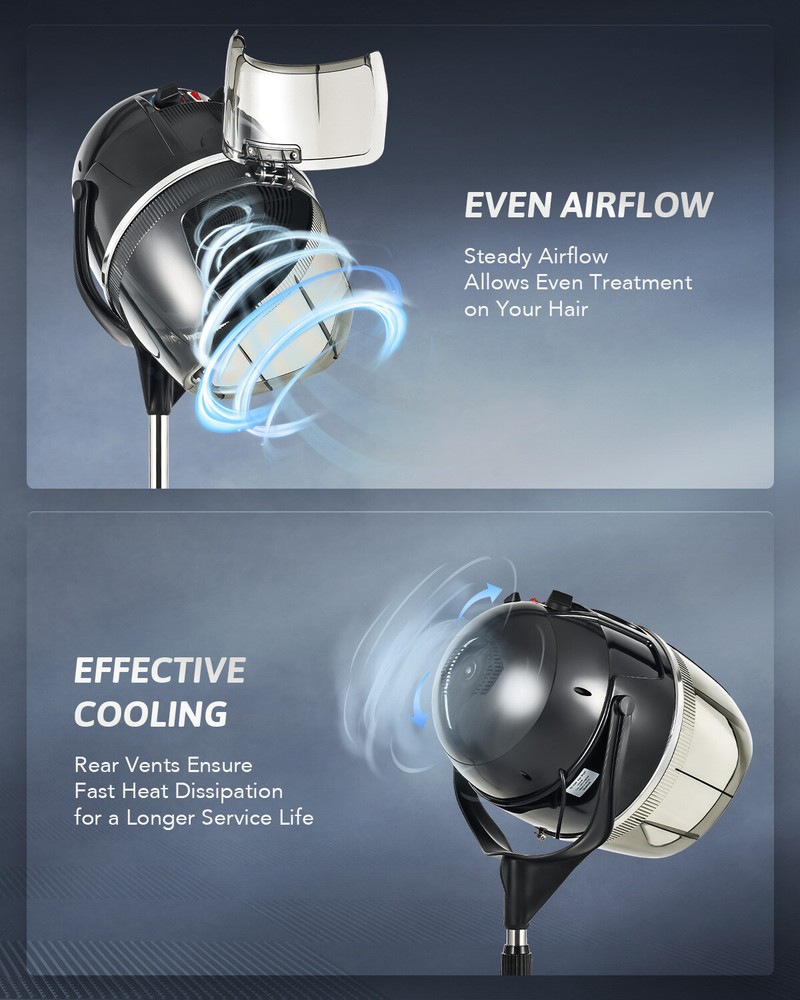 Description Dry, style & perm your hair while staying in control & comfortable with CO-Z's hooded hair dryer stand! Whether it’s dyeing hair, conditioning, or just everyday drying, our standing hooded hair dryer has you covered. It’s designed with spa, salon, and home use in mind to give your hair the gentle pampering and care it needs when drying hair for day to day use. High Power Motor & Easy to Adjust Temperature Settings Our standing hooded dryer with rolling wheels uses a 1300W motor to deliver heating up to 75°C while maintaining low noise levels. You can easily adjust the heat using the control panel on the back. Sturdy Build & Thoughtfully Designed for All Hair Types We use a stainless steel heating element to deliver even heating to all areas so you can use it for a wide range of applications. The hood hair dryer is suitable for use on all hair types while keeping your hair safe and protected. There’s more to love: Helps protect against dryness, split ends, frizz, and more 6'11" long cord makes it a breeze to plug in and move around The hair dryer hood swivels with ease for a comfortable fit Designed with vents on the hood to prevent overheating for long-term use Can easily be assembled quickly by following the simple instructions Enjoy salon & spa quality hair blowouts in the comfort of your home with our hooded hair dryer with stand! Features Protect and Style Everyday: CO-Z's stand hair dryer uses a 1300W heating system to deliver even heating to dry, perm, color, condition, and style your hair. It’s ideal for use in homes, spas, salons, and more to volumize hair and leave behind a subtle shine while protecting against dryness, split ends, and frizz. Adjustable Temperature and Timer: This professional hair dryer offers an adjustable temperature range of 40-75°C (104-167°F) to provide a suitable fit for safely drying all hair types. It also lets you set the automatic timer from 0 to 60 minutes to give you more control. Get the Right Height & Angle: This standing hair dryer for hair salons and home use easily adjusts from 50" to 63" in height and offers smooth 360° rotation for the hood to ensure your comfort while drying hair. Quiet and Easy to Roll: This standing hooded hair dryer is designed for a low-noise experience, allowing you to read, talk, or listen to music while your hair dries. The 360° caster wheels enable smooth and effortless rotation in any direction. Quick Assembly & Safe Use: The rotating stand hair dryer features an intuitive design and comes with step-by-step instructions for quick assembly. Its durable stainless steel heating frame along with the air vents on the back of the hood prevents overheating for lasting safe use. Specifications Rated Power: 1300W Temperature Range: 104-167°F (40-75°C) Timer Range: 0-60 min. Height: 50-63 in. (126-160 cm) Hood Angle Range: 30-180° Hood Inner Dimensions: 11.8 x 10.6 in. (30x27 cm) Net Weight: 13.9 lb. (6.3 kg) Package List 1x Hooded Helmet 1x Upper Pole 1x Lower Pole 5x Legs 1x Base Hub 1x Base Bottom 1x Instruction Manual On Nov 18, 2025 at 18:30:49 PST, seller added the following information: