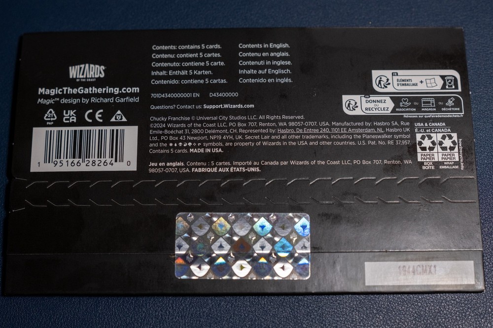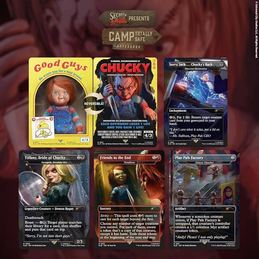 NEW-Sealed, ordered direcly from the Secret Lair website. Here are the details from the site: Whelp . . . we got a new Good Guys doll delivered, and it came with this strange amulet and ancient tome. So obviously we started reading the tome aloud and when we turned around the doll was gone! Weird, right? Now we keep hearing the pitter-patter of small feet echoing all around the Secret Lair . . . but it’s probably nothing. Inspired by the whole experience, we’ve made five killer cards that are all dolled up with Chucky and absolutely must be possessed. Wanna play? Art by Domenico Cava, Justine Cruz, Eddie Mendoza, Sean Vo, Tomasz Zarucki & Thomas Roach 1x Reversible Kardur, Doomscourge as “Chucky” 1x Phyrexian Reclamation as “Sorry, Jack . . . Chucky’s Back” 1x Varragoth, Bloodsky Sire as “Tiffany, Bride of Chucky” 1x Twinflame as “Friends to the End” 1x Genesis Chamber as “Play Pals Factory”