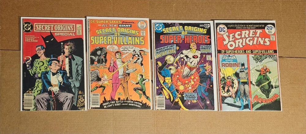 DC comics SECRET ORIGINS of Super Heroes and Super Villains # 7 DC GIANT SECRET ORIGINS OF SUPER HEROES # 10 DC GIANT SUPER-STARS PRESENTS SECRET ORIGINS OF SUPER VILLAINS # 14 DC SECRET ORIGINS Special # 1 4 books All comic books come sleeved and back boarded. I do combine shipping