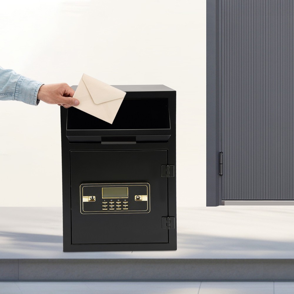 A high-quality safe can enhance your sense of security even more. This safe is made of sturdy steel and has strong reliability. The sturdy anti-theft lock can protect your valuable property, and the intelligent alarm system allows you to keep an eye on its status at all times. Having this high-quality safe allows you to confidently go out. Drop Box for Money and Mail, Drop Slot Safe, Cash Depository Safe Description A high-quality safe can enhance your sense of security even more. This safe is made of sturdy steel and has strong reliability. The sturdy anti-theft lock can protect your valuable property, and the intelligent alarm system allows you to keep an eye on its status at all times. Having this high-quality safe allows you to confidently go out. Key Features Build to Last: It is made of sturdy and thickened steel plates, and adopts laser cutting and galvanizing processes , with the advantages of high strength, wear resistance , and compression resistance , providing you with long-lasting and reliable protection. Thoughtful Design: The drop slot safe has spikes at the end and they're pretty sharp, definitely prevents nosy hands from trying to pull anything out. Large Capacity: The large size of 13.86*13.86*21.65 inches provides you with 1.31ft³ of space to help you organize important items and reduce clutter. The wide top can also be used for temporary storage of small items. Powerful Protection: The sturdy lock, thickened material, two types of unlocking keys, and high-quality lock tongues provide your valuables with anti-theft protection. Intelligent Alarm System: If the password is entered incorrectly three times, an alarm will sound and it will automatically lock for 3 minutes, while pressing the wrong key four times will lock for 10 minutes. After entering an incorrect password or being hit by a heavy object, a 60-second alarm sound will sound. An alarm will also sound when the battery is low. The intelligent alarm system enhances its security. Convenient to Use: The delivery port with a maximum opening angle of 90 ° allows you to deliver important items into the safe without opening the door, making it more convenient to use. Easy Installation: Thanks to its pre-drilled mounting holes and screws, you can mount this product on the wall or you can directly place it on the floor for more flexibility and convenience. Nice Appearance: The classic black and smooth lines give the product a sense of modernity and fashion, which can blend with most home and office decoration styles. Customer Service: Communication is the best way to solve problems. If you have any problems, please feel free to contact us. We will reply and solve the problem for you as soon as possible. Details Round Corners: The smooth corners can better ensure safety during installation and use. Practical Handle: The handle design on the delivery port makes it easy for you to open and drop items. Application It is an ideal choice for families, offices, hotels, schools, hospitals, shopping malls, banks, and restaurants to store valuable assets and belongings, such as money, check payments, files, documents, birth certificates, social security cards, coins, etc. Specification Color: Black Style: Modern Material: Steel Process: Laser Cutting, Galvanizing Shape: Rectangular Assembly Required: No Mounting Type: Wall Mount, Floor Mount Capacity: 0.037m³/1.31ft³ Steel Board Thickness: 1mm/0.04in Battery Type: 4*AA Batteries(Not Included) Product Size: 35.2*35.2*55cm/ 13.86*13.86*21.65in Package Size: 42.2*42.2*62cm/16.61*16.61*24.41in Gross Weight: 10.2kg/22.49lbs Net Weight: 9kg/19.84lbs Package Included 1* Safe 4* Keys 1* Spare Battery Box 1* English Manual All Accessories for Assembly Notes Please read the manual carefully before using it and pay attention to the dimensions of this safe before purchasing. It is advisable to set the combination when the safe door is open. After setting the code, you should enter the new code several times. The door can be locked after confirmation. You can change the password to their specific password after purchasing a new safe. Please refer to the manual for the change method. Please keep the spare key and spare battery box in a safe place. Please check that all keys are complete. Please do not leave large amounts of cash and valuables unattended. When moving and relocating, please do not hit the safe to avoid damage. When not in use for a long time, please remove the battery from the battery box. Please bring your own 4*AA batteries. Please allow the slight color difference caused by the shooting light and 1-3cm error due to manual measurement, and make sure you do not mind before ordering. Payment Delivery details Terms of sales About us Contact us Payment We accept ebay payment 。 Fees such as import duties, taxes are not included in the item price or shipping costs. These charges are the buyer's responsibility. Delivery details Shipping: 2-9 working days to: USA Terms of sales We maintain high standards of excellence and strive for hundred percent customer satisfaction. Feedback is very important to us. We hope that you contact us immediately before you give neutral or negative feedback, so that we can address your concerns. It is impossible to address issues if we do not know about them! About us Your satis faction is our ultimate goal. We work hard to earn your trust and future business. Our certified technicians have tested each item before shipping. The unit comes with 1 year limited warranty on all manufacturing defects. a) If you receive a defective item, you may return it or ask for a discount. Please contact us within 14 days after you receive the package. b) What you returned must be intact and in its original packaging as re? u. Customer is responsible for shipping costs of the returned item. c) We will cover the cost of shipping back t with the shipping rate indicated in the registration page. We will send you a new unit or refund the full payment you paid. Thank you