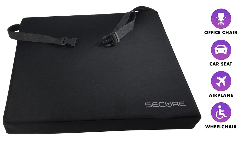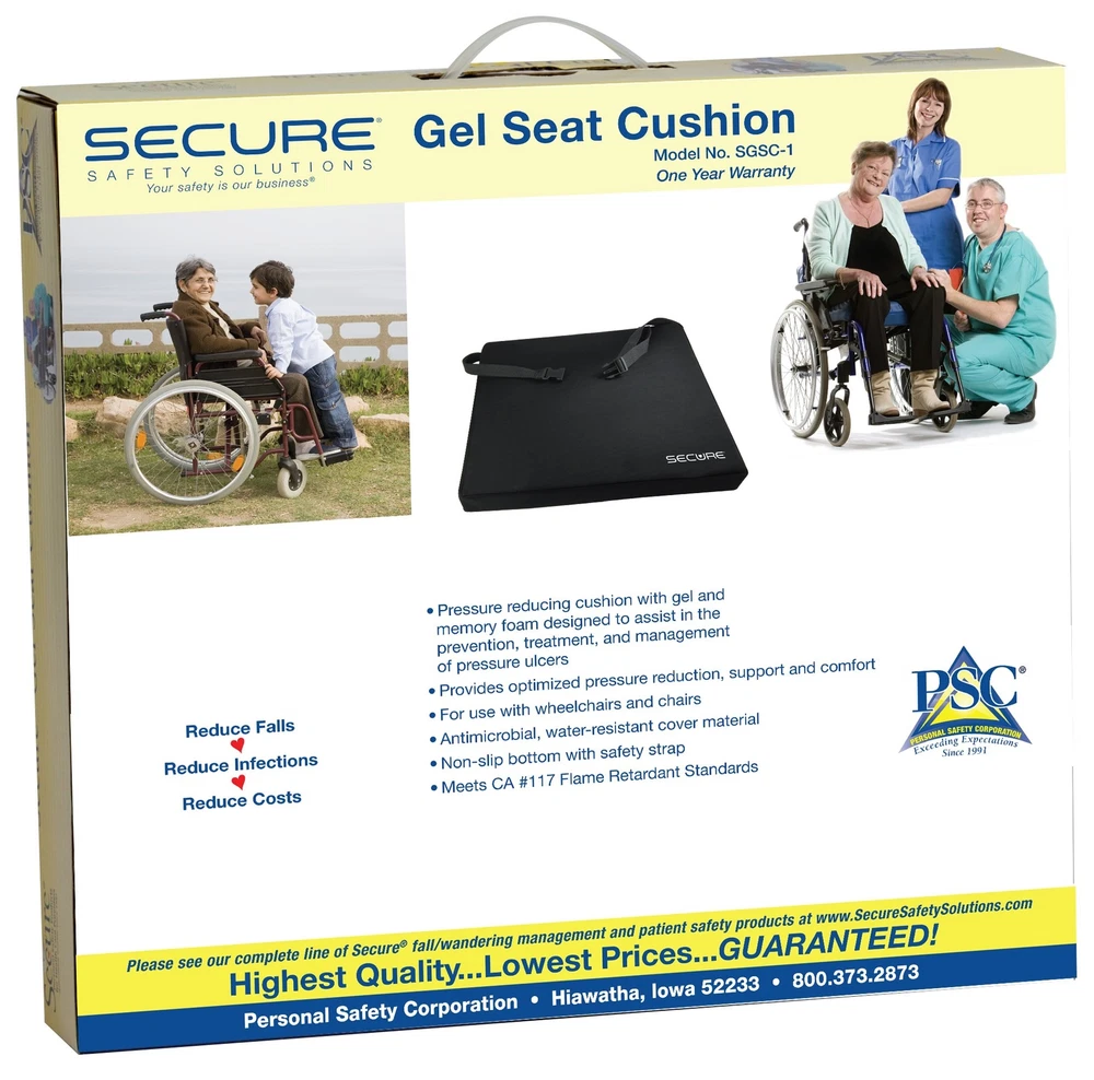 Secure Wheelchair Gel Cushion with Safety Strap - 18x16x3 Inch - Gel & Foam Orthopedic Chair Pad - Decubitus Ulcer & Sciatica Pain Pressure Relief & Comfort for Seniors MAXIMUM COMFORT & PRESSURE RELIEF - Combining high-density memory foam with a dynamic gel inner layer provides maximum comfort and pressure relief. The Secure gel cushion can help prevent and treat pressure ulcers, sciatica, lower back pain, numbness, and coccyx tailbone pain. SUPER SOFT NEOPRENE COVER MATERIAL - The outer cover is water-resistant and flame-retardant with a zippered cover that is easily removable and cleanable by hand or washing machine. DESIGNED FOR LONG-TERM USE - The slip-free and non-shear surface of the cushion is designed to provide maximum stability and support while ensuring optimal comfort for the user. The gel and foam incorporated in the seating surface help reduce pressure on the tailbone (coccyx) and provide a plush feel to alleviate discomfort during long-term use. Additionally, the durable design of the seating surface ensures reliable performance and promotes proper wheelchair posture and positioning, further enhancing the user's comfort and safety. SAFETY STRAP FOR SECURE INSTALLATION - The wheelchair cushion has an adjustable attachment strap that can securely fasten it to any wheelchair or standard chair. The Secure Gel Cushion is versatile and can be used with various chairs such as transport chairs, office chairs, computer desk chairs, kitchen/dining room chairs, living room couches, sofas, and recliners. The cushion provides maximum comfort and pressure relief, making it perfect for use during sporting events, concerts, and other activities when placed on benches and bleachers. Additionally, it can also be used on a car/truck seat, train seat, or airplane seat. CUSHION DIMENSIONS: 18"W x 16"D x 3"H. This chair cushion comes with a one-year warranty and hassle-free replacement guarantee from Personal Safety Corporation, a US-based company that has been serving healthcare facilities and caregivers since 1991. Shipping We offer FREE shipping on all orders! We use a selection of shipping services such as UPS, FedEx, USPS etc. We only ship to the lower 48 states, no APO/FPO addresses or PO Boxes allowed. Local pickups and combined shipping options are not provided at this time. Return You can return a product for up to 30 days from the date you purchased it. Any product you return must be in the same condition you received it and in the original packaging. Please keep the receipt. Payment We accept payment by any of the following methods: PayPal Please pay as soon as possible after winning an auction, as that will allow us to post your item to you sooner! Feedback Customer satisfaction is very important to us. If you have any problem with your order, please contact us and we will do our best to make you satisfied. Contact Us If you have any queries, please contact us via ebay. We usually respond within 24 hours on weekdays. Please visit our eBay store to check out other items for sale! Thank you for shopping at our store.
