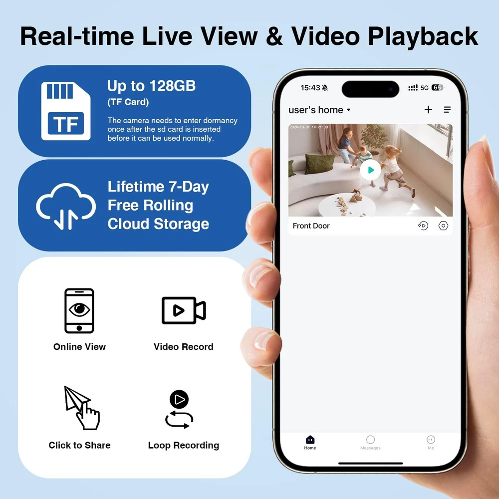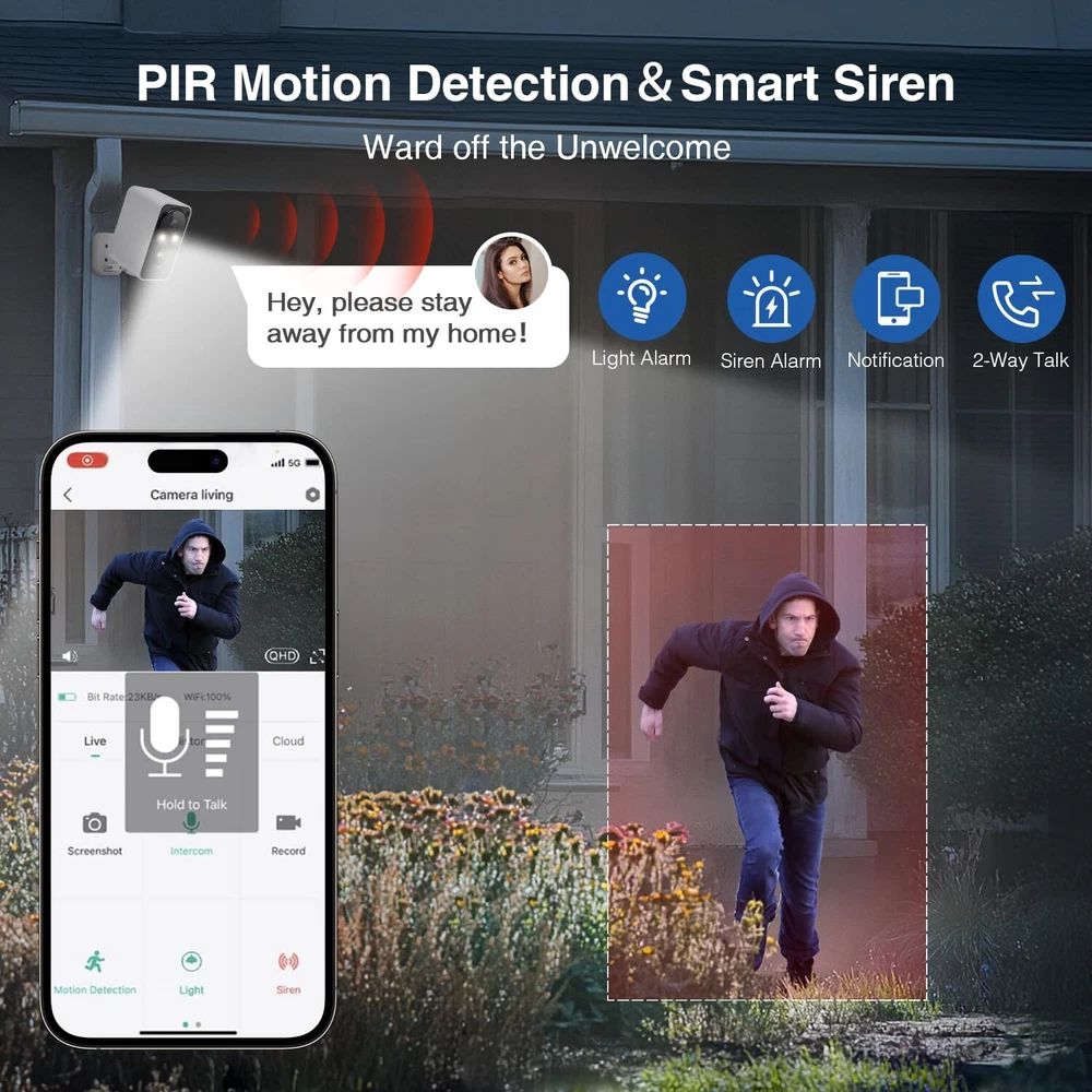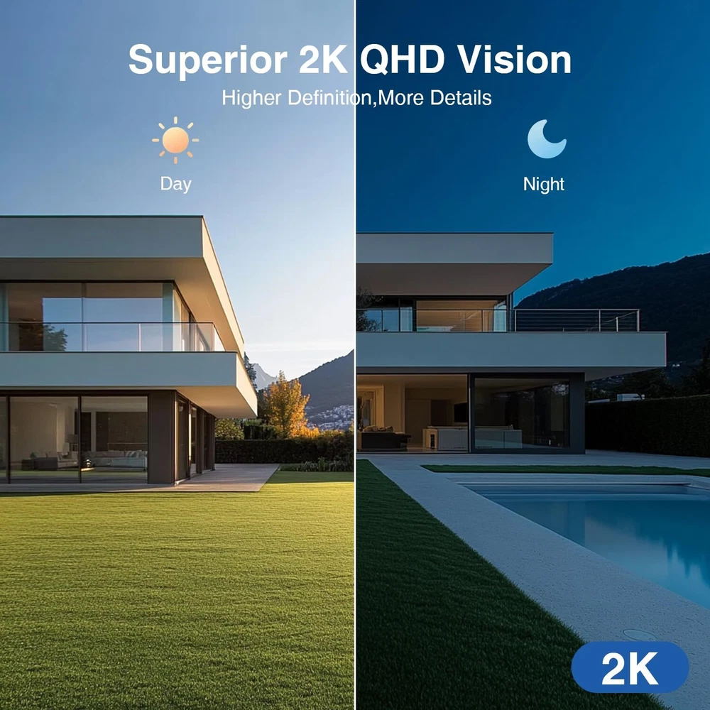 【 2K 180° Pan View & Color Night Vision】Experience superior surveillance with our security cameras wireless outdoor featuring a 2K resolution and a 180° Pan View. These Cameras for home security deliver sharp, high-definition images and expansive coverage, ensuring that no detail goes unnoticed. Equipped with color night vision, these Security cameras wireless indoor provide clear and vivid footage even in low light conditions, enhancing your home security cameras' effectiveness around the clock. 【 PIR Motion Detection & 2-Way Talk】This cameras for home security are designed with PIR Motion Detection to accurately identify and notify you of any movement. The 2-Way Talk feature allows you to communicate directly through the wireless cameras for home security, enabling real-time interaction with anyone near the camera. This capability of our security camera indoor ensures that you stay connected and informed, providing peace of mind whether you're at home or on the go. 【 Multi-Alarm & User Sharing】Enhance your home protection with the Multi-Alarm and User Sharing features on our WiFi camera for home security indoor wireless. You will receive multiple types of alerts for any suspicious activities, and the User Sharing function lets you share access with family and friends to monitor your home together. This collaborative approach with our Security cameras helps strengthen your home security, making it more robust and reliable. 【True Wireless Security Cam and Long-lasting Rechargeable Battery】Experience the ultimate flexibility with our battery security cameras wireless outdoor that come with a robust rechargeable battery. These Security cameras wireless outdoor can be placed anywhere, whether as an outdoor camera wireless or a camera for home security indoor wireless, without the hassle of wires. The long-lasting battery ensures consistent performance, eliminating the need for frequent recharges and providing continuous protection.(2.4Ghz WiFi Only) 【Apply to 7-day Rolling Cloud/TF Card Storage】Secure your video footage with Lifetime Free 7-day Rolling Cloud Storage and optional TF Card Storage (not included) on our security camera for home. Easily access your recordings within a week and use the TF card for additional local storage. This feature guarantees that your essential footage remains safe and accessible, whether you're using the security camera outdoor for outdoor surveillance or the camera for home security indoor for monitoring inside your home.(Not Support 5G WiFi)