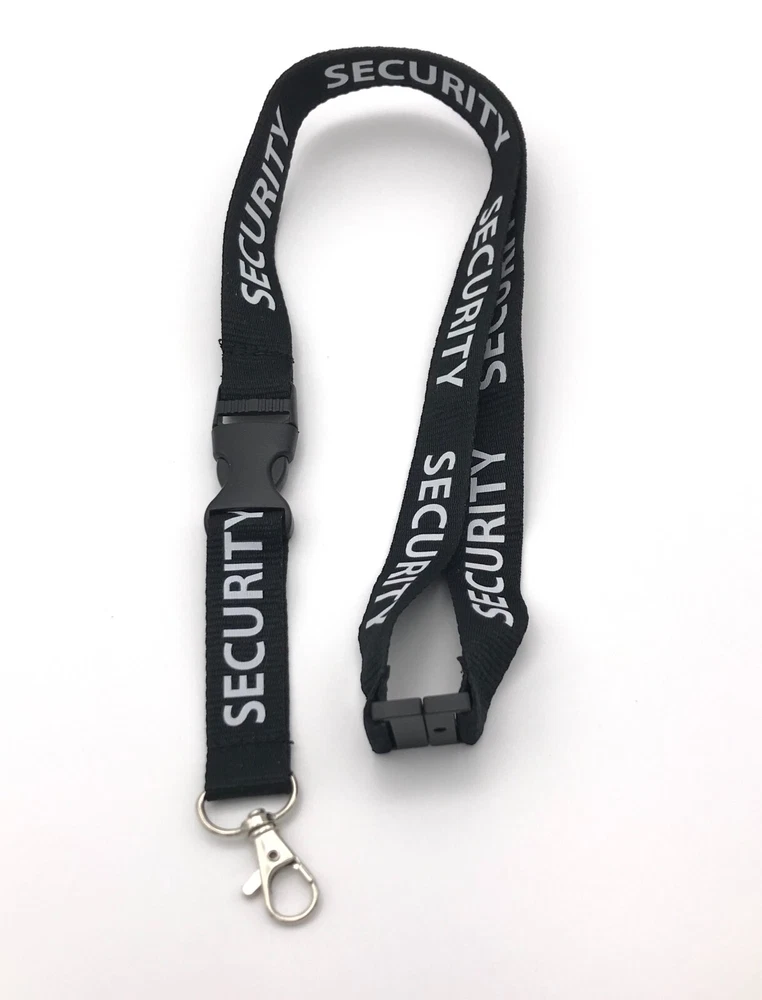 New Black (Security Lanyard) with Swivel Nickel Clip White Letters (SECURITY) Breakaway neck clip Release clip separates bottom from top Size: 18” Length, ¾” Width Ships in new clear bag