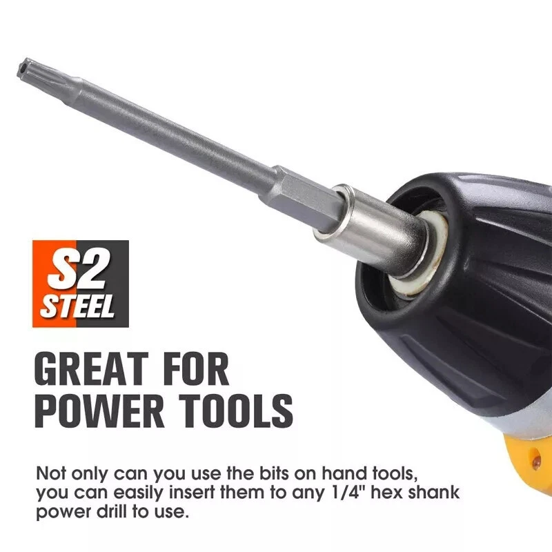 Product Characteristics High Q uality I ndustrial G rade M aterials: The Torx screwdriver bit set is made of high-quality S2 alloy steel with a special heat treatment process to increase the torque and full hardness of the bit, and it has good wear resistance and is more durable than regular Torx screwdriver bits. High P recision M achining T echnology: The product adopts CNC precision machining technology to ensure the accuracy of the product, so that the drill can withstand the instantaneous impact of large torque pneumatic tools, which greatly improves the service life of the product itself. Magnetic: The magnetic Torx screwdriver drill set can quickly and easily adsorb screws, greatly improving your work efficiency. Repeated use does not diminish the magnetic force. Suitable F or A V ariety O f P ower T ools: The 1/4" hexagon handle allows it to accommodate a wide range of power tools, allowing you to quickly change chucks. Suitable for electric drill, air drill, electric screwdriver, manual screwdriver and so on. A W ide R ange O f U se S cenarios: It can be widely used in automobile, home, industrial and other maintenance, and can also be used in other screw drives. Mechanical P rinciple D esign: Strong torque, high torque, after contact with the screw head, the impact reaction force generated by the impact screwdriver is absorbed by the torque part, effectively preventing the damage of the tool head. Straight and concentric, tight bite. Product Specification Status: 100% Brand New Material: S2 A lloy S teel Quantity: 12PCS Shank T ype: 6.35mm/ 1/4" H ex S hank Length: 1.97"/50mm Tool H ead S pecifications: T5, T6, T7, T8, T9, T10, T15, T20, T25, T27, T30, T40 Package Included 12 PCS × 50mm Torx Screwdriver B it Attention P lease 1. Please allow manual measurement error of 1-5mm. Make sure you don't mind before you buy. 2. Due to lighting effects, brightness contrast Settings of the display, etc., there may be some slight differences in the hue of the picture and the actual item, please make sure you don't mind.