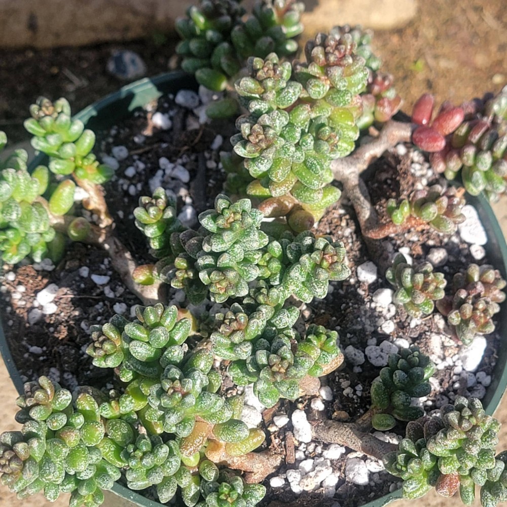 Sedum furfuraceum , commonly known as Bonsai Sedum , is a compact and slow-growing succulent that is highly prized for its unique, bonsai-like appearance. Native to the arid regions of Mexico, this plant features small, rounded, and tightly clustered rosettes of thick, fleshy leaves that are a pale, grayish-green color, often tinged with purple or reddish hues when stressed by sunlight or drought. The stems are short and dense, creating a bushy, almost miniature tree-like shape, which is why it is often compared to bonsai trees. Sedum furfuraceum thrives in well-draining soil, preferring bright light and minimal watering, making it a perfect addition to a rock garden or a potted display. In late spring or summer, it may produce small, star-shaped yellow flowers that attract pollinators like bees, though its primary appeal lies in its sculptural form rather than its blooms. This succulent is particularly popular for use in indoor gardens, containers, and terrariums, where its manageable size and striking appearance make it a standout. Like many sedums, Sedum furfuraceum is highly drought-tolerant and requires little maintenance, making it an ideal choice for those looking for an attractive, low-care plant. Please Note: Plant will ship bare root with little to no dirt, and you will receive a plant similar to the one in the photo. Fragile: leaves may curl, fall off, or bruise during shipping. Will recover with proper light, water, and leaf shedding. Returns & exchanges: Not accepted Please contact us if you have any issues with your order