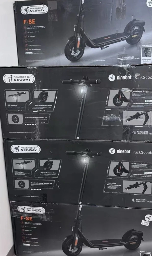 The Segway Ninebot F-SE Electric Kick Scooter is a reliable and stylish choice for adults looking to commute or enjoy a leisurely ride. With its sleek black design and Segway brand reputation, this refurbished model ensures quality and performance. The electric kick scooter provides a smooth and efficient ride, making it a convenient option for urban transportation. Whether you're heading to work or taking a weekend cruise, the Segway Ninebot F-SE is sure to impress with its versatility and ease of use. Top Speed Up to 19 mph (approx. 30 km/h) Max Range Up to 25 miles (approx. 40 km) Motor Power 300W nominal (peak output around 700W) Max Load 265 lbs (120 kg) Scooter Weight Approx. 23.6 lbs (10.7 kg) Tires 10-inch self-sealing, tubeless pneumatic tires (anti-puncture) Braking System Electronic brake + front and rear disc brakes Lights Front & rear LED lights with turn signals Water Resistance IPX4 – splash-resistant for everyday commuting Smart Features Apple Find My support for anti-theft tracking Folded Dimensions Approx. 35.8” × 15.7” × 34.8–40.7” (91 × 40 × 88–103 cm)