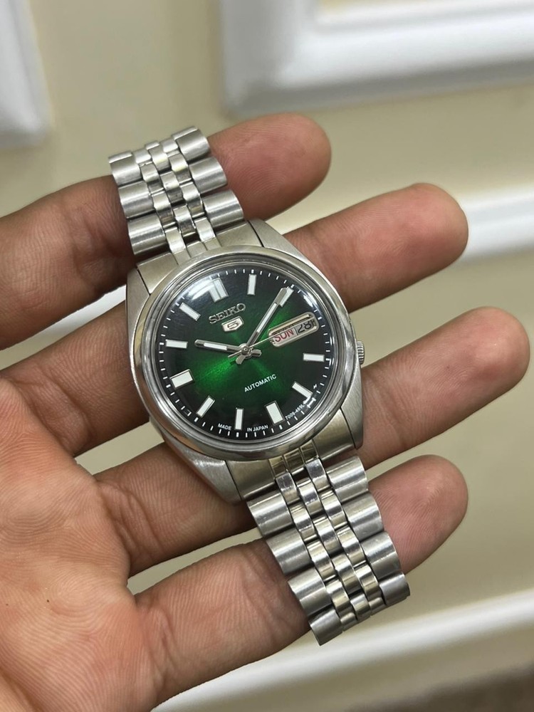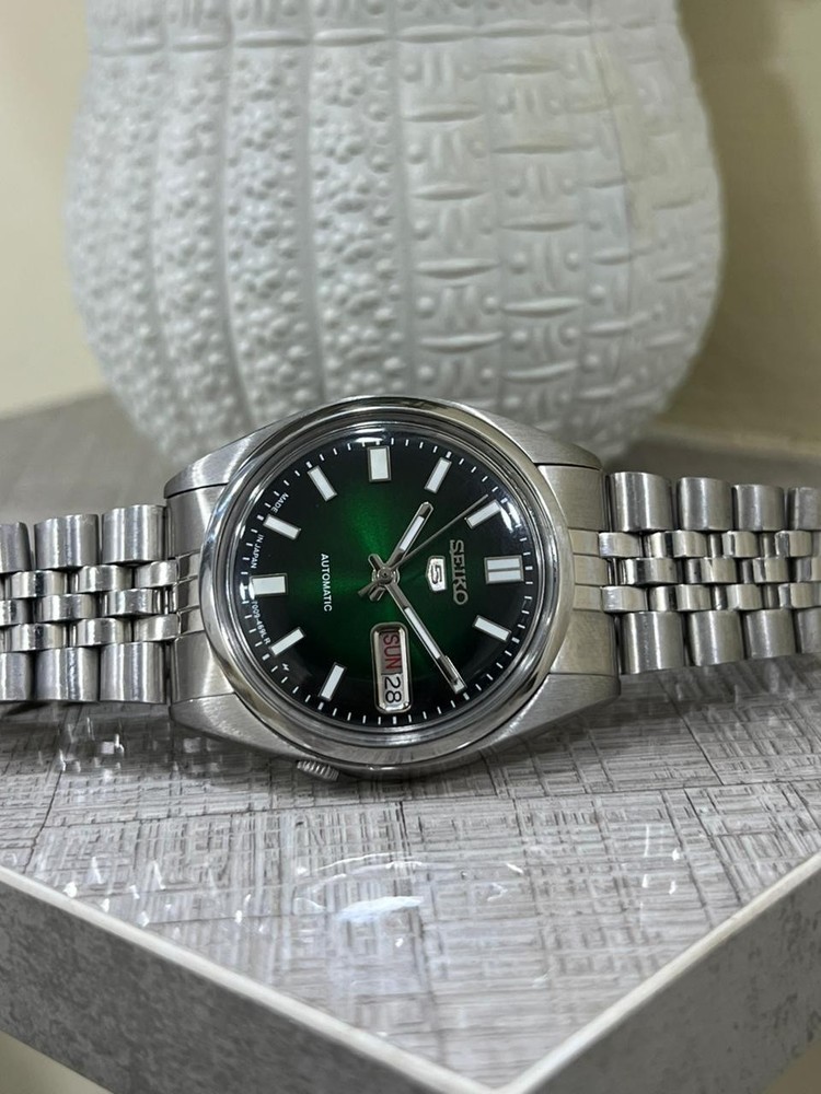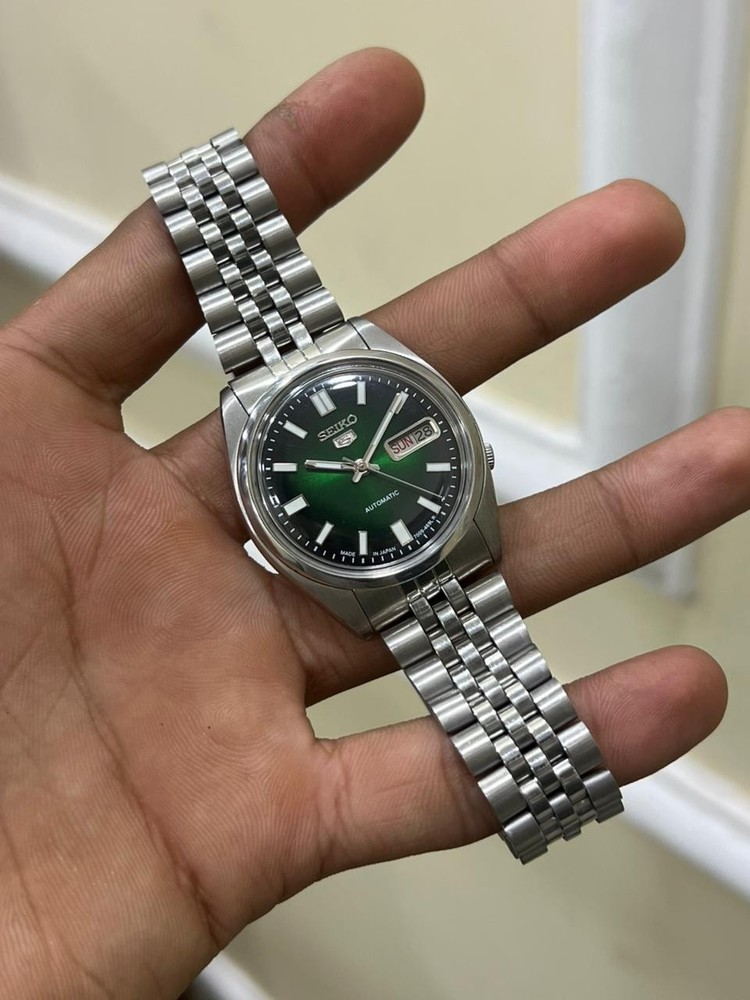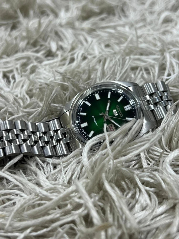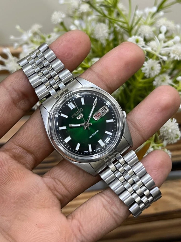 The Seiko 5 Automatic Green Dial Men's Watch (Model 7009) is a vintage timepiece manufactured in Japan between 1990-1999. This watch features a classic round shape with a silver stainless steel case and bracelet. The dial has a sunburst pattern with stick indexes, and it includes day/date features. The automatic movement with 17 jewels offers reliable timekeeping, making it suitable for both dress/formal and casual occasions. With a solid caseback and polished finish, this Seiko 5 watch is a stylish and timeless accessory for any man's wardrobe.