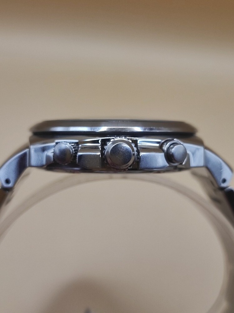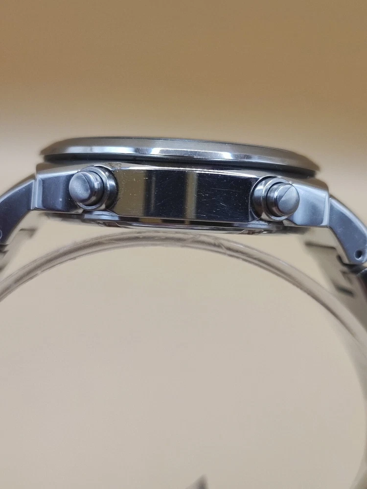 This Seiko Chronograph is a sleek, reliable timepiece with a sharp black dial and classic Japanese precision. The quartz movement keeps perfect time, and the very good condition means it looks nearly new despite minor wear. The stainless steel case and band have minimal scuffs, nothing distracting. Perfect for daily wear or special occasions—love the clean, professional look!