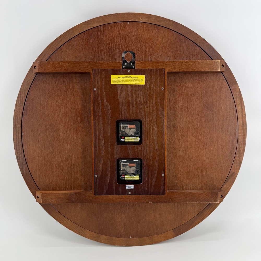 Seiko wall clock featuring a classic Roman numeral dial and a secondary sub-dial. The clock is housed in a rich wood-grain frame, adding a touch of traditional elegance to any space. The dual-movement design ensures accurate timekeeping. The back of the clock reveals dual quartz movements and a sturdy hanging mechanism. Wall hanging instructions are provided for safe installation. ***Clock has yellowing on white edges as pictured. Works great! Measurements: • Diameter: 24 in Type: Hanging Wall Clock Features: 12-Hour Display Movement: Quartz (Battery Powered) Power Source: Battery Powered Frame Material: Wood Room: Living Room, Home Office/Study, Dining Room, Bedroom, Hallway Finish: Oak Shape: Round Number Type: Roman Numerals Keywords: Seiko clock, Roman numeral clock, wood clock, wall clock, dual dial, quartz movement, traditional, elegant, home decor, timepiece, vintage style