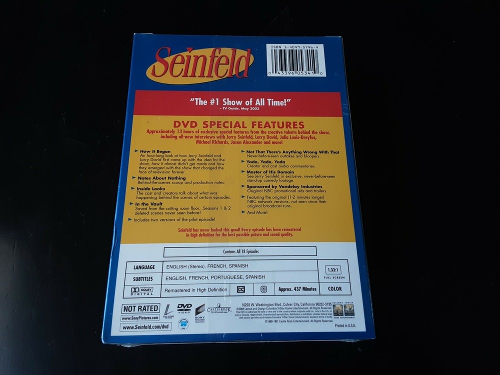Producer:Paul TibbittItem Length:7.35 inSub-Genre:Box SetsDirector:Art Wolff, Tom CheronesUPC:0043396409767Genre:TV ComedyRun Time:414 min.Movie/TV Title:Seinfeld: the Complete First and Second SeasonsRating:NRFormat:DVDItem Weight:0.35 lbgtin13:0043396409767Country/Region of Manufacture:MexicoItem Width:5.35 inStudio:Sony PicturesLanguage:EnglishItem Height:0.58 inNumber of Discs:4