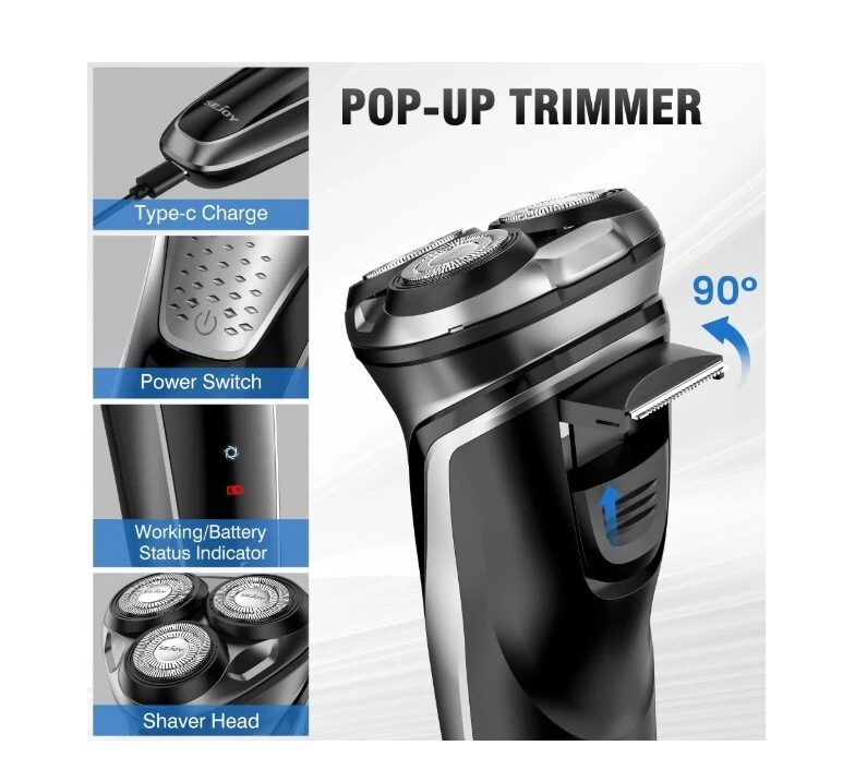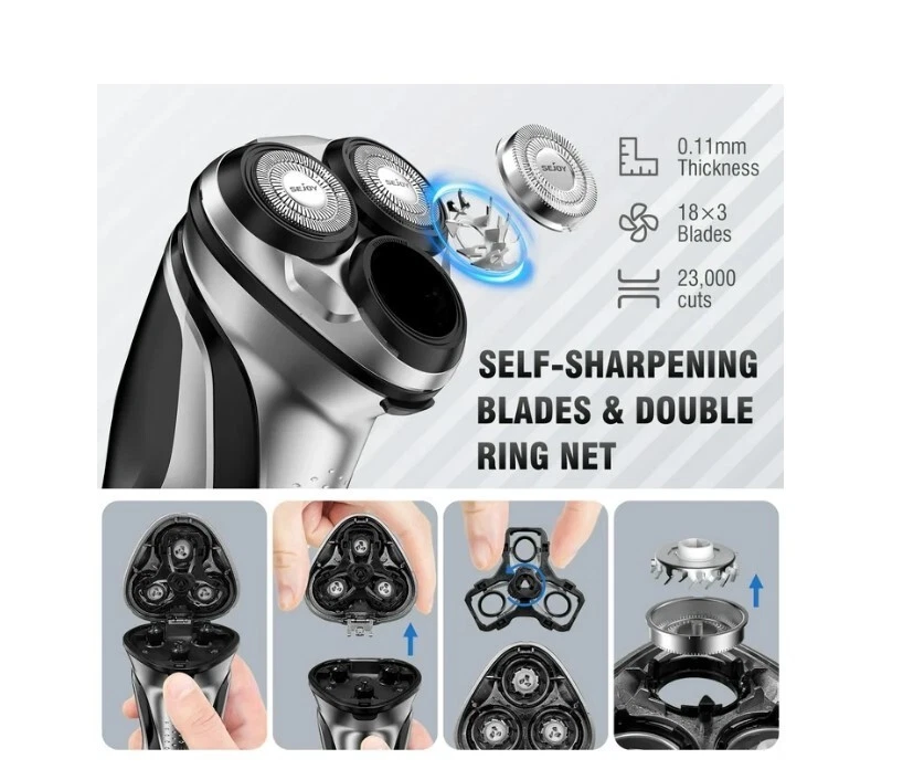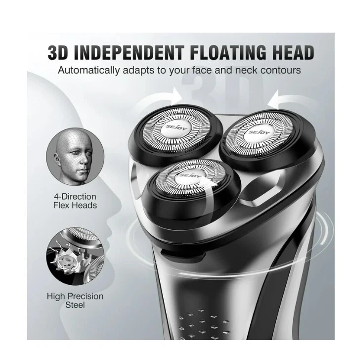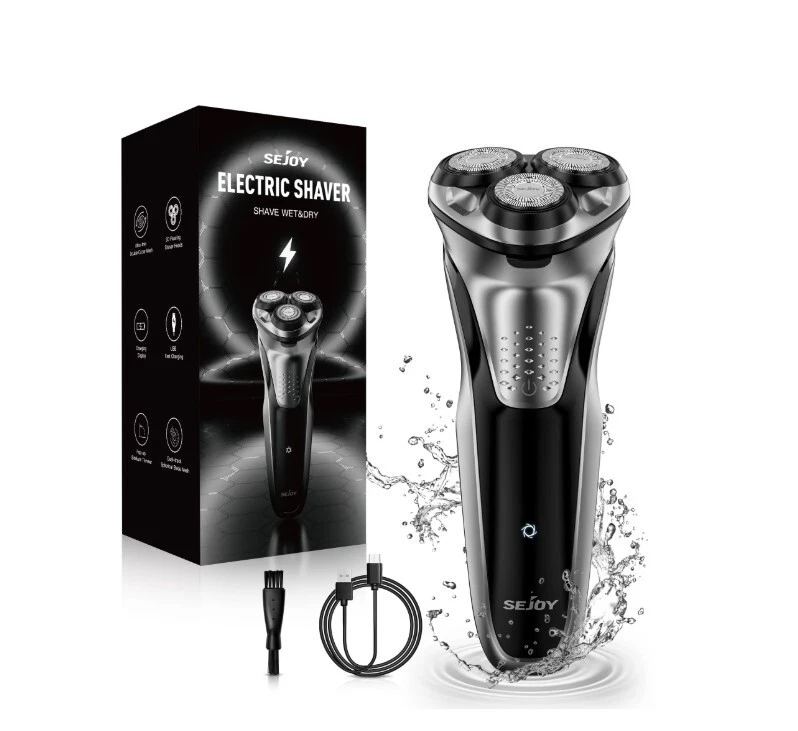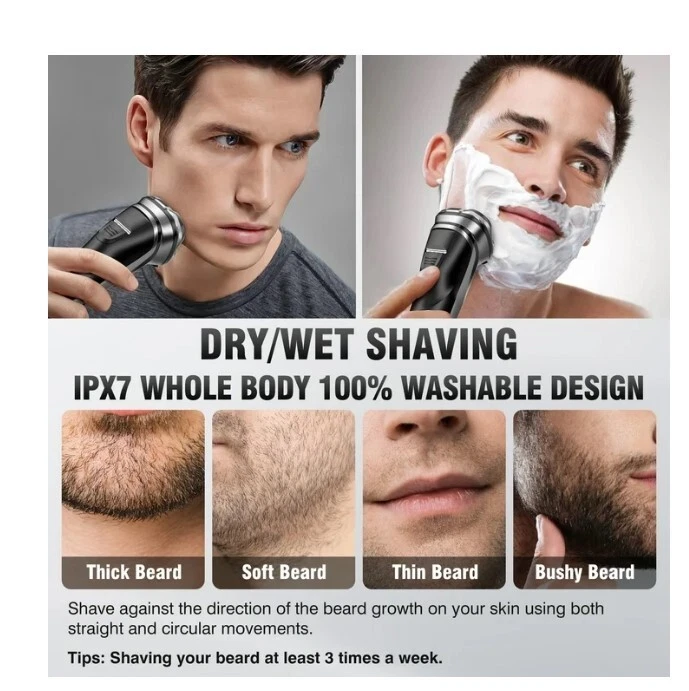 ABOUT THIS ITEM 【3D Floating & Self-Sharpening Blade】This electric razor is equipped with three independent floating blade heads with 0.11mm ultra-thin hypoallergenic double-track blade net and self-sharpening blade (18×3 blades). Does not pull and damage the skin. The 3D floating rotating shaver head automatically adapts to the contours of your face and neck for a more comfortable and efficient shaving experience. In addition, self-sharpening blades are designed for durability, saving you time when changing blades. 【Wet & Dry Use】IPX7 waterproof design suitable for wet and dry use, support foam or water shaving. You can use it as much as you like in the shower, sink, bathtub, rainy days, etc., in addition, the included cleaning brush makes it easy to clean collected hairs. 【USB Fast Charging】This men's cordless shaver is equipped with a USB cable (no USB adapter), which supports charging through computers, power banks, cars and other USB devices, etc. Enjoy a 90-minutes shave with just 1 hour of USB fast charging. Its global voltage compatibility and USB charging feature are perfect for every businessman and traveler. 【Corded & Cordless Use】This electric shaver for men is available to use both corded and cordless, so it can still be used in the future even if the battery dies. Do not delay use at any time. 【Ideal Gift & Thoughtful Service】Package Included - electric shaver, USB-C cable (without adapter), small cleaning brush, user manual. With the electric shaver, you can do shave easily every day. It is perfect gift for father,husband,boyfriend and son for for Christmas,Birthday,Valentine’s Day, Fathers Day or any other special occasion.If you are not satisfied with our men electric razor, please contact us at any time. We will answer your question as our first priority and give you the solution within 24 hours. Specifications: Product name: Electric razor Rated voltage:3.7V⎓ Rated power:8W Waterproof rate:IPX7 Note: 1.For long beards, you may get better results by first trimming your beard with the pop-up trimmer, before shaving with the rotary heads. 2.The skin may be slightly irritated during the first few shavings,which is normal. It is recommended to use the shaver regularly(at least 3 times a week)within 3 weeks to allow the skin to adapt as soon as possible.