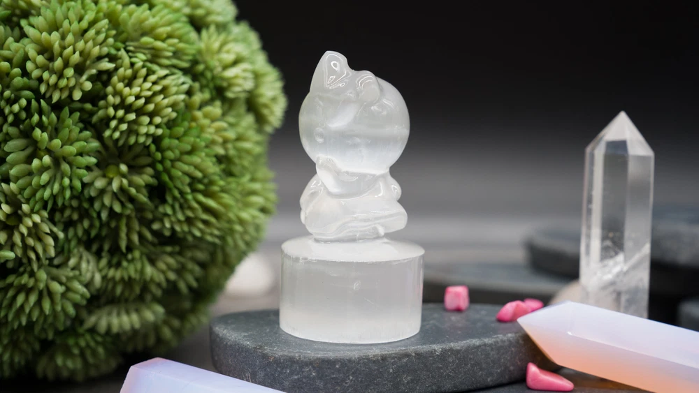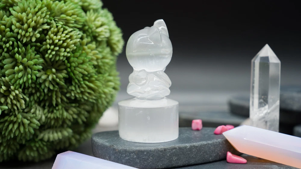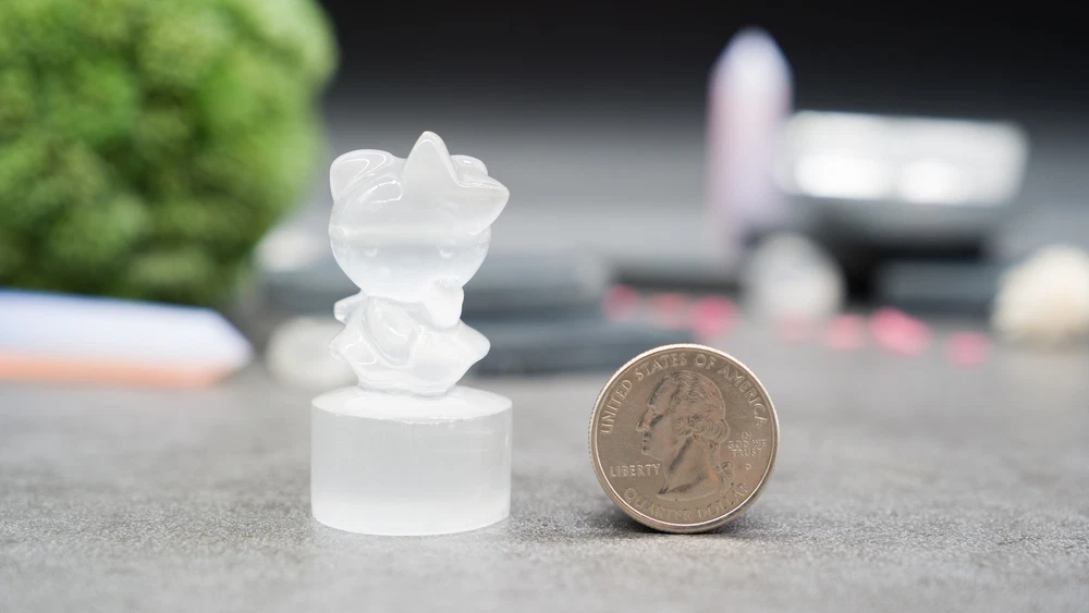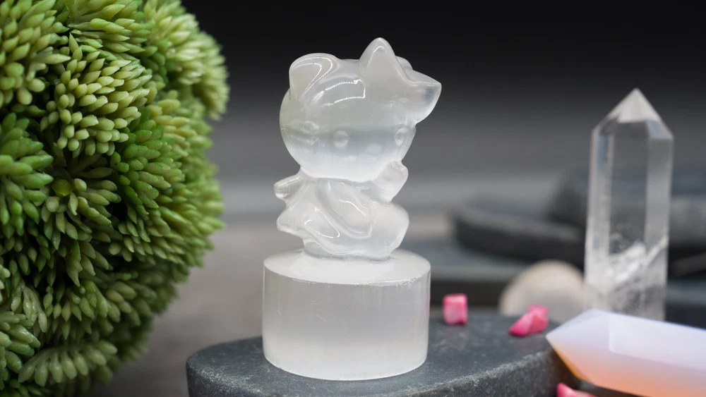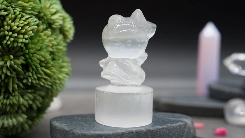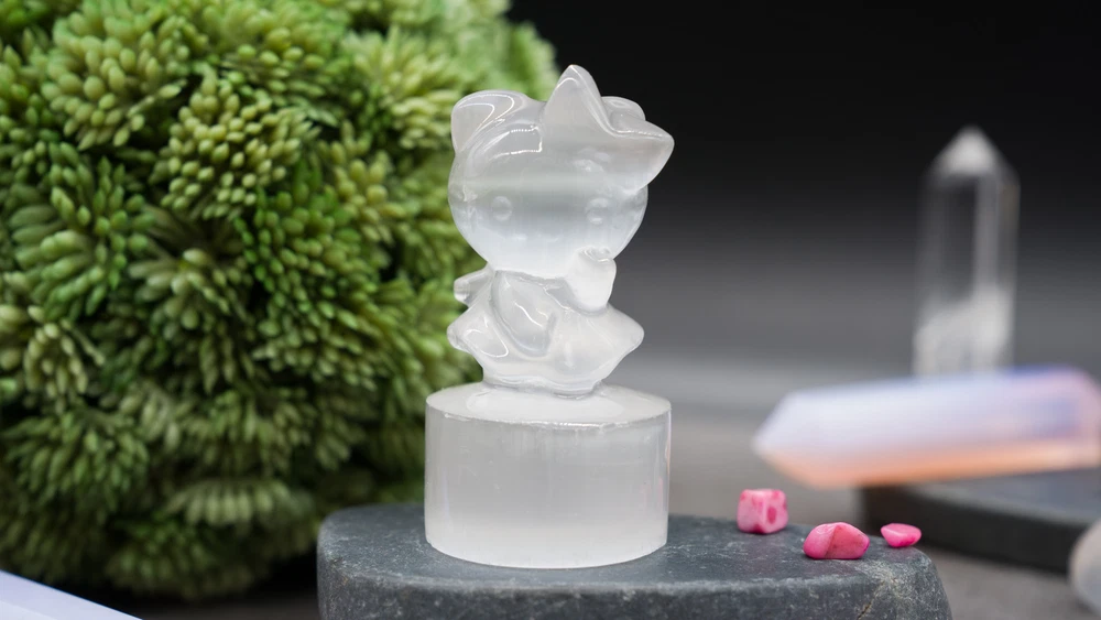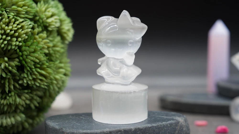 These cute Hello Kitty character inspired fanart carvings are made from natural selenite crystal (also known as satin spar) and measure approximately 2" high. They make a great gift for the crystal or Hello Kitty lover in your life! You will receive one (1) intuitively chosen crystal carving. Selenite provides for wisdom and clarity of the mind, expanding ones awareness of the self and of ones surroundings. It opens the crown and higher crown chakras and provides spiritual purity. Use for cleansing your spirit as well as your other stones! Gems and crystals are great for altars, grids, terrariums, pocket stones, gifts, home decorating, jewelry, collecting and more! They are also wonderful additions to meditation, spiritual, and chakra work. *This listing uses professional photography to provide samples of our collection of products. Each stone is natural, unique and beautiful so please expect slight variations in color, texture, and size. You will receive a product similar to that of the picture, but not the exact product. **Please note that healing crystals are not a replacement for traditional medical treatment and are not meant to replace consulting with a medical professional and do not guarantee any medical cure for any condition. ***This is not an officially licensed Sanrio product, and only features the likeness of Hello Kitty on a fanart basis.