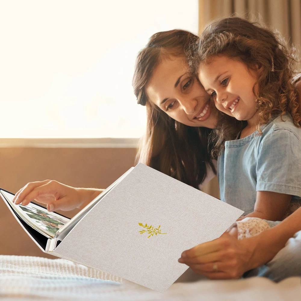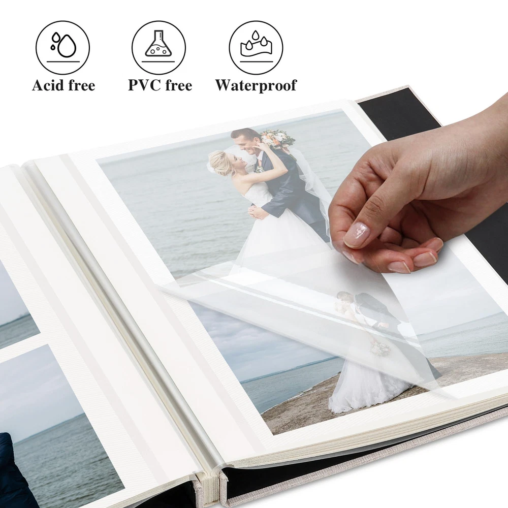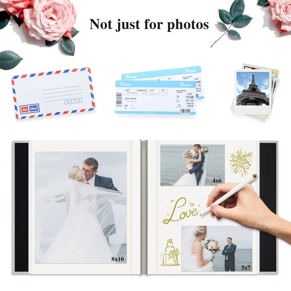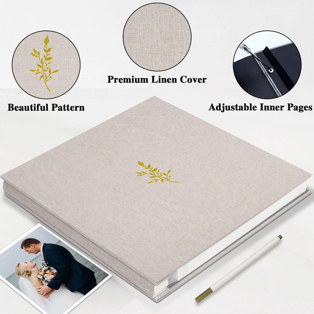 Embossed Cover: The cover of the scrapbook is wrapped in linen fabric with a beautiful foil stamped design, showing the vintage and exquisite style, making it an ideal gift for your family and friends Product Size: The wedding album measures 11 x 10.6 inches, with a total of 20 sheets / 40 pages. Each album can hold up to 120 photos sized 4x6 in or 40 photos sized 8x10 in. Acid-Free & PVC Free: Made from high-quality acid-free materials, our waterproof inner pages allow you to clearly display and protect your cherished memories without worrying about fading or damage over time. Preserve your precious moments for years to come Self Adhesive: Each scrapbook paper comes with adhesive on the surface. Simply peel off the protective film and securely attach your photos without the need for additional adhesives. Suitable for many size photo, such as 2"x3", 4"x6", 5"x7", 8"x10" Multi-purpose: Our DIY album is not only suitable for storing photos, but also perfect for creating scrapbook-style recipes, journals, travel notes, and more. You can use it to collect any meaningful items like stickers, stamps, plane tickets, postcards, etc