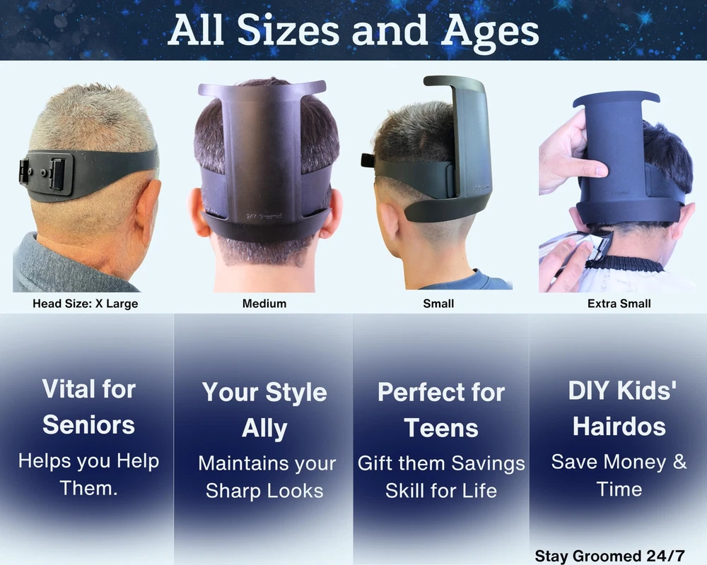 SELF HAIR CUTTING TOOLS FOR MEN - YOUR ULTIMATE STYLING COMPANION! Tired Of Salon Expenses And Messy Necklines? Considering Self-Haircuts? Mastering The Tricky Spot At The Back Of Your Neck Is Now Easier With Our Versatile All-In-One Hair Cut Kit. It Shaves Neck Hairlines, Creates Fade Guidelines, And Guides Precise Trimming And Blending. Say Goodbye To Mistakes, Save Time, And Effortlessly Achieve A Polished Look. NECK LINE UP TOOL: Confidently Shape Up Your Neckline In Various Styles With Our Self Hair Cutting Kit. Whether Square, Curved, High, Low, Faded, Or Tapered, Take Control Of Your Look With Ease, No Assistance Needed From Spouses Or Friends.! FADE GUIDE BAND: Craft Precise Straight Or Curved Fade Guidelines Effortlessly With Our Perfect Fade Haircut Tool. Engineered With High-Quality And Durable Materials, It Ensures Seamless Fade Results. ONE SIZE FITS ALL: Experience Comfort Without Compromise With Our Secure Velcro Locking Feature. Designed For All Head Sizes, The Silicone Band Ensures A Snug Fit And Consistent Grip. HAIR STENCIL- EFFORTLESS BLENDING: Effortlessly Blend Your Hair With Our Unique Haircut Guide That Moves Seamlessly Along Your Neck, Serving As The Ultimate Blend Friend For Creating Classic And Elegant Hairstyles. SAVINGS IN TIME AND MONEY: Envision A Future Where You Never Have To Pay For A Haircut Again And Reclaim Those Weekend Hours Spent Visiting Salons. Will Help You Acquire This Crucial Skill, Providing Almost 100% Return On Investment With Each Use! HAIRCUTTING KIT INCLUDES 1 X Self Haircut Silicone Band 1 X Neckline Shaving Template 1 X Instructions Sheet REVOLUTIONIZE YOUR GROOMING EXPERIENCE – ADD THE 247GROOMED SELFCUT KIT TO YOUR CART NOW AND SAY YES TO LOOKING GROOMED 24/7! ✂️OF SAVINGS & STYLE: Master The Art Of Self Hair Cut With One Of The Best Self Hair Cutting Tools for Men. Save Time And Money With Our Unique Hair Cutting Guide – No More Weekend Salon Visits. Sharp Looks Forever! 👌STABLE NECKLINE SHAVING TEMPLATE: Our Stable Neckline Tool Stays Put During Your Haircut, Ensuring Straight Necklines And A Consistently Clean Finish. Suitable for All Neck Sizes. ✂️FADE GUIDE FOR MEN HAIRCUT: Our Fade Haircut Tool Helps Create Flat Or Curved Lines For Your Perfect Fade. Fits Kids And Adults. Our Fade Guide For Men Helps Self Haircuts And Helping Others. 😌 COMFORTABLE FIT FOR XS-XXL HEAD SIZES: Our Hair Cut Guide For Men Ensures A Snug Fit Without Uneasy Stretching. Perfect Companion of Your 360 Mirror and Fade Comb. 🎓 PRACTICE MAKES PERFECT: Focus On Mastering The Skill—The Hairline Shaping Tool Helps You Prevent Mistakes & Become a Pro DIYer. Keep Your Consistent Looks With Our Self Hair Cutting Kit.