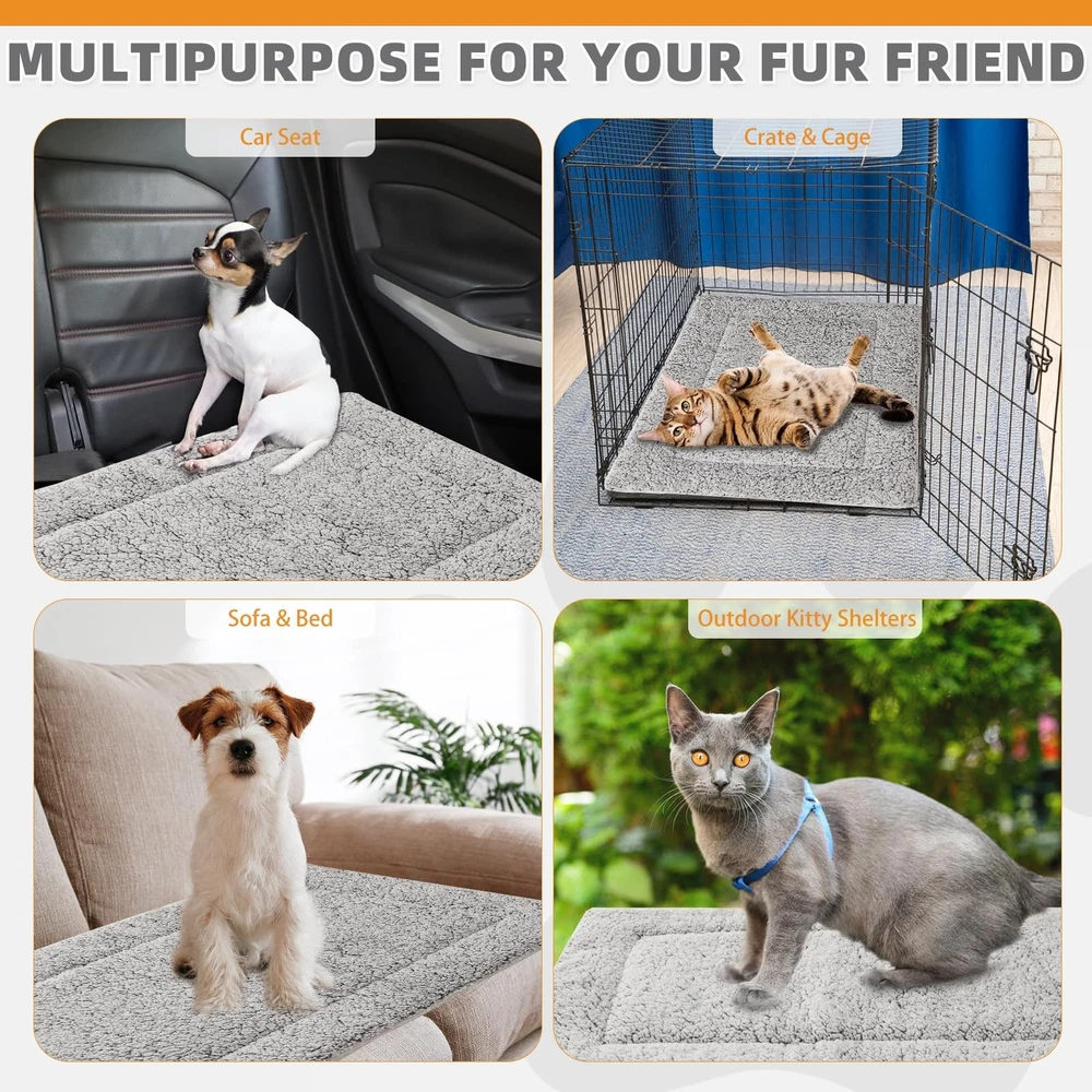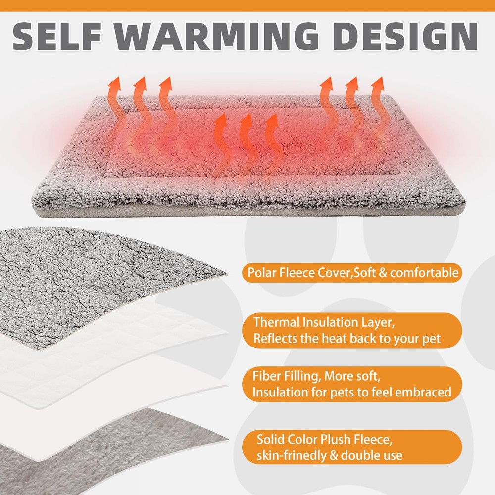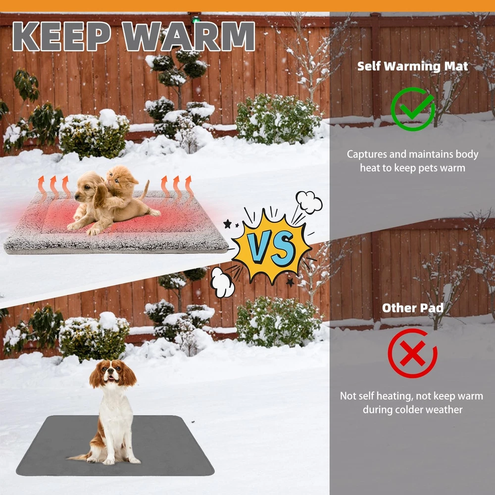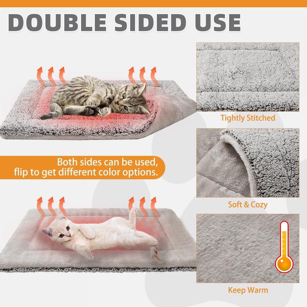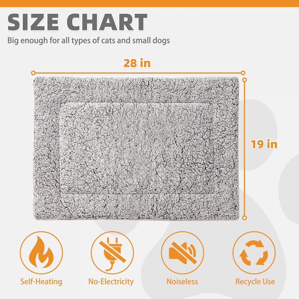 cat self heating mat SUITABLE FOR MOST CATS AND SMALL DOGS: Our pet beds are suitable for cats, dogs, puppies, and other small animals. The size of the self heating pad is 19 * 28 inches. It's self-heating and safer than any other electronic mat. SELF-WARMING & SAFE DEFINED: Made with special composite aluminum foil and polyester wadding, which will help to lock in the heat and keep your cat warm without plugging it in. No plug or electricity needed! The self-heating technology absorbs, holds, and reflects pets' body heat to provide natural warmth. It effectively keeps your pets toasty warm on cold days. CAN BE USED ON BOTH SIDES: Our self heating cat pad adopts a double-sided design, with one side made of fleece material and the other side made of solid color short plush. Different tactile sensations can bring different experiences to pets. Both can bring warmth and a sense of security to your furry baby. NO NOISE MATERIAL: No more complaining about the crinkly noise! Our self-heating cat pad has been upgraded to a completely noise-free heat-reflective polyester film. The bottom of the mat is not made of rubber material, so there is no need to worry about cats making noise when they run and jump onto the mat. Very suitable for indoor and outdoor pets to nap for a day. EASY TO CARRY FOR MULTIPLE SCENARIOS: Our self heating pad is lightweight and does not require a power connection. You can place it anywhere you want. It is a good helper for protecting sofas, hardwood, chairs, and beds. Suitable for use on floors, sofas and beds, car seat cushions, cages, and other occasions. Keep your pet warm during the cold winter season.