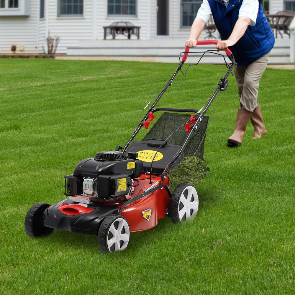 Self-Propelled Gas Powered Lawn Mower with Bagger with 4-Stroke Engine 20” 140cc Description The self-propelled gas lawn mower is not only a powerful assistant for garden maintenance, but also a finely crafted representation of the beauty of nature. This lawn mower is equipped with a high-performance 4-stroke engine, which brings new vitality to vast green spaces with its surging power. It is not only a tool, but also a free green paintbrush in the hands of gardening enthusiasts to outline vibrant landscapes. Key Features Outstanding Performance: Its premium 4-stroke engine can provide strong power (5HP), large displacement (140CC), and fast speed (2800rpm), which can help you quickly and efficiently complete mowing tasks. Clean Mowing: The manganese steel straight blade with a 20in mowing width undergoes quenching treatment, which is sturdy, sharp, and not afraid of gravel, ensuring that every mowing is clean and tidy. Thoughtful Design: It has 8 gears to adjust the mowing height (1-3.2in), making it easy to set the suitable height according to different grass species and growth conditions to ensure consistent aesthetics after lawn mowing. Continuous Work: Its 15.9gal large bag, 0.42gal gas tank and 0.2gal engine oil tank can collect more grass cuttings at once. Whether it is mowing large lawns or dense grass, it can easily handle without frequently emptying and refueling, making the mowing process more continuous. Easy to Install: The package includes all the necessary accessories and a detailed manual for installation, making installation simple. It can be put into use soon. Effortless Movement: The self-propelled mower does not require manual propulsion, making operation simple. Its reasonable height (42.1in) allows you to use it without bending over for a long time, reducing the burden on your waist and making it more comfortable to use. Modern Appearance: With plastic spraying, its surface is smoother and the color is more vivid. Its classic red and black combination not only meets your appearance needs, but also highlights your fashion and taste. Guaranteed Customer Service: Our friendly customer service team will be happy to help you with any questions you may have regarding this product. Details Soft Handle: The handle with a soft surface can effectively reduce hand pressure to maintain a comfortable grip. Practical Silencer: With a silencer, it has a noise level of about 70dB during operation, allowing you to enjoy a quieter experience while mowing. Stable Wheels: The four wheels are made of reinforced nylon, and the grooves on the wheels grip the ground more firmly, effectively preventing shock and ensuring a smoother mowing process. Application It is suitable for lawn mowing work in sports fields, community greening, municipal greening, urban gardens, villas, estates, and other places. Specification Material: Steel, Nylon, Manganese Steel Treatment: Quenching, Plastic Spraying Color: Red, Black Power Source: Gasoline Engine Type: 4-stroke, Single Cylinder, OHV Gasoline Engine Start Type: Pull Start Drive Type: Self-propelled Power: 5HP Speed: 2800rpm Displacement: 140CC Noise Level: About 70dB Gasoline Tank Capacity: 1.6L/0.42gal 4-stroke Engine Oil Tank Capacity: 0.6L/0.2gal Grass Catch Bag Capacity: 60L/15.9gal Mowing Height Adjustment: 8 Gears (25-80mm/1-3.2in) Mowing Width: 51cm/20in Wheel Size: 19.5cm/7.7in (Front); 24.5cm/9.7in (Rear) Unfolded Product Size: 54*158*107cm/21.3*62.2*42.1in Folded Product Size: 54*119.5*67cm/21.3*47.1*26.4in Package Size: 88.5*60*47.5cm/34.8*23.6*18.6in Net Weight: 32.65kg/72lbs Gross Weight: 36.85kg/81.2lbs Package Included 1* Self-propelled Gas Lawn Mower 1* English Manual All Accessories for Installation Notes Please read the manual carefully and pay attention to the safety precautions inside. Please allow the slight color difference caused by the shooting light and 1-3cm error due to manual measurement, and make sure you do not mind before ordering. Payment Delivery details Terms of sales About us Contact us Payment We accept ebay payment 。 Fees such as import duties, taxes are not included in the item price or shipping costs. These charges are the buyer's responsibility. Delivery details Shipping: 2-9 working days to: USA Terms of sales We maintain high standards of excellence and strive for hundred percent customer satisfaction. Feedback is very important to us. We hope that you contact us immediately before you give neutral or negative feedback, so that we can address your concerns. It is impossible to address issues if we do not know about them! About us Your satis faction is our ultimate goal. We work hard to earn your trust and future business. Our certified technicians have tested each item before shipping. The unit comes with 1 year limited warranty on all manufacturing defects. a) If you receive a defective item, you may return it or ask for a discount. Please contact us within 14 days after you receive the package. b) What you returned must be intact and in its original packaging as re? u. Customer is responsible for shipping costs of the returned item. c) We will cover the cost of shipping back t with the shipping rate indicated in the registration page. We will send you a new unit or refund the full payment you paid. Thank you. Contact us Business Hour Business Hour: Monday To Friday: 8:30 AM to 5:00 PM (Beijing China time) Due to time zones, our reply to your questions may not be immediately. But within above working time, we will reply your email within 24 hours. If it's non-workdays, please kindly be patient and wait till Monday. Please contact us with ebay message. Please feel free to contact us if you have any questions. Monday To Friday: 8:30 AM to 5:00 PM (Beijing China time) Due to time zones, our reply to your questions may not be immediately. But within above working time, we will reply your email within 24 hours. If it's non-workdays, please kindly be patient and wait till Monday. Please contact us with ebay m