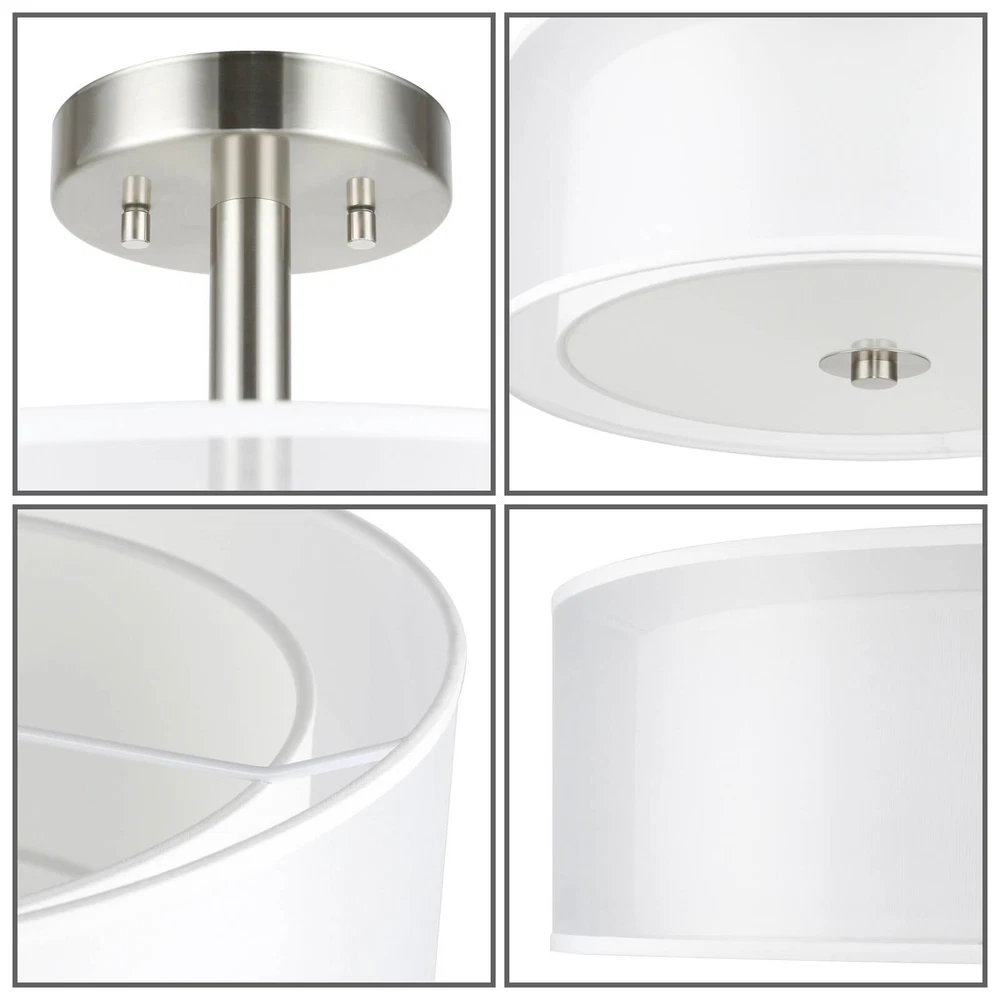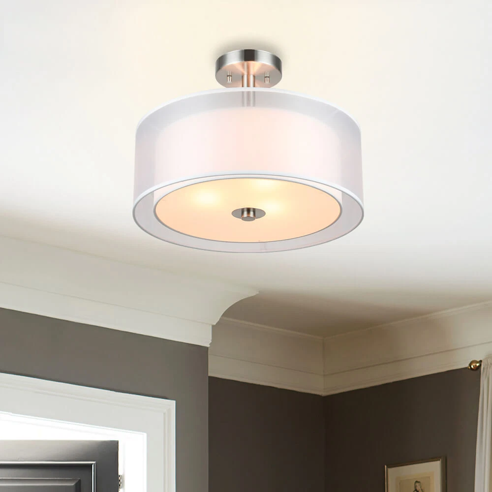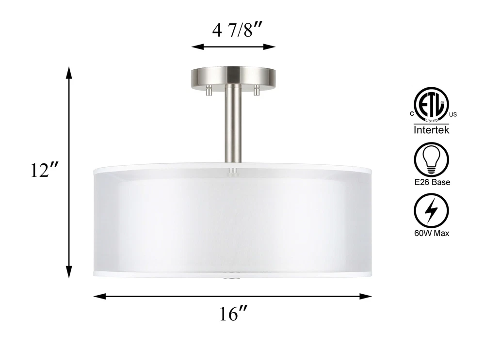 Drum semi flush ceiling light featuring a smooth brushed nickel finish and white fabric shade, frosted glass diffuser. Its double fabric shade creates a comfortable and brings all the modern elements. This elegant drum ceiling fixture is perfect for Kitchen, Bedroom, Living room, dining room, foyer or any living areas, of which will lend elegance to your space while surrounding it with relaxing ambient light. Semi flush mount ceiling light in brushed nickel finish. Dual fabric shade and frosted glass diffuser. Product Specification Dimension: W:16" x H:12" Finish: Brushed Nickel Shade Material: Double Fabric Shade + Frosted Glass Diffuser Shade Dimensions: (Outer) W:16" x H: 6" (Inner) W:13ʺ x H: 5ʺ Socket: E26 Socket 3x60W (Bulb not Included) Compatible with Variety of Bulbs This semi flush mount is suggest to use “A” Type Max. 3x60W bulbs for medium base (E26 socket) (incandescent bulb or equivalent CFL / LED bulbs) The fixture is dimmable when using the dimmable bulb with compatible dimmer switch. Bulb not Included. Semi Flush Ceiling Light Collection XB-SF1199-BN Dimension W: 18" x H: 12" Finish Brushed Nickel Shade Material Fabric Shade + Glass Diffuser Shade Diamension W:16-5/8" x H: 4-1/2" Socket E26 Wattage 3x60W (Bulb not Included) XB-SF1303-BN Dimension W:14" x H:9-3/4" Finish Brushed Nickel Shade Material Fabric Shade + Glass Diffuser Shade Diamension W:14" x H: 5-1/8" Socket E26 Wattage 3x60W (Bulb not Included) XB-SF1124-CH Dimension W:15" x H:12" Finish Chrome Shade Material Metal Shade + Glass Diffuser Shade Diamension (Outer) W:15" x H: 5" Socket E26 Wattage 3x60W (Bulb not Included) Terms of Sale Shipping Policy: We ship within 1-2 business day from receipt of payment. We do not change your shipping address by email. Please make sure your address is correct before checking out and making payment. Payment Policy We accept most major credit cards, including, but not limited to, Visa, Mastercard, American Express, or Discover card and PayPal. All major credit cards are accepted through secure payment processor eBay Payment. All payment must be made within 7 days of the end of the auction. Otherwise, an "Unpaid Item Dispute" will be filed with eBay. Return Policy If you have any questions about purchases or concerns on our products or accessories replacement, please feel free to contact us through eBay's Message Center. However, if a return is required, please kindly noted that all returns should be met with following conditions: All return requests must be within 30 days of receipt. Return item must be in original condition as received (brand new in sealed package / with tags). Refund of purchase price less original shipping will be issued. Return postage is buyer's responsibility. Original shipping is not refundable for products features free shipping unless we're found at fault. We won't be able to refund if products are found damaged or used. Thank you. Any accessories (such as: Glass) broken via transportation can be replaced for free within 30 days receipt. However, If exceed the valid date to contact us that need you to pay for the accessories (such as: Glass), thanks!