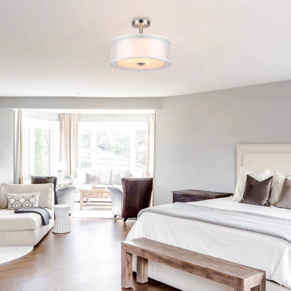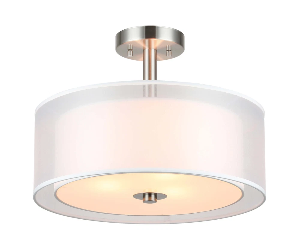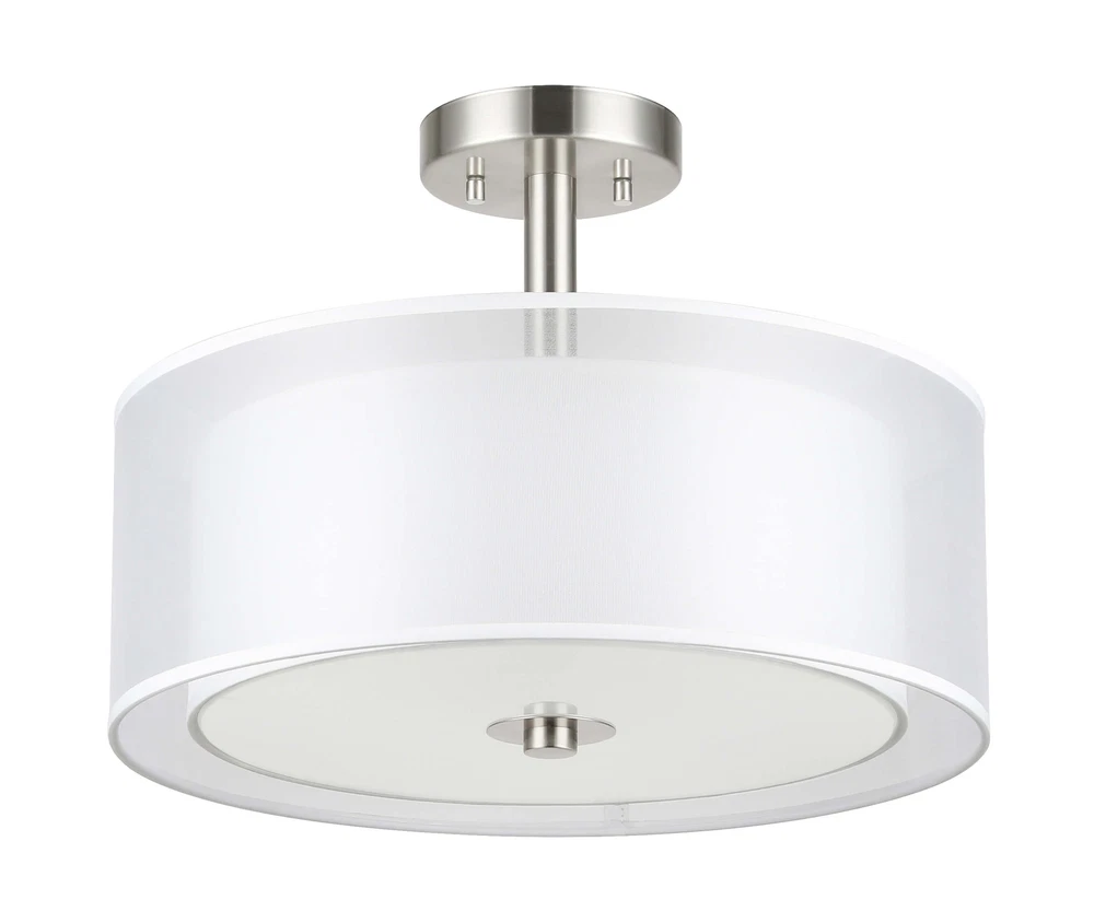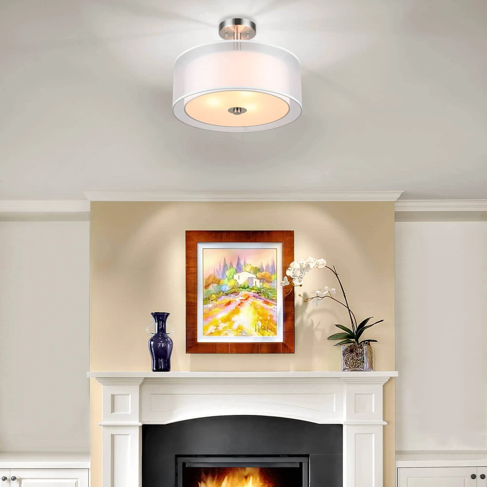 Drum semi flush ceiling light featuring a smooth brushed nickel finish and white fabric shade, frosted glass diffuser. Its double fabric shade creates a comfortable and brings all the modern elements. This elegant drum ceiling fixture is perfect for Kitchen, Bedroom, Living room, dining room, foyer or any living areas, of which will lend elegance to your space while surrounding it with relaxing ambient light. Semi flush mount ceiling light in brushed nickel finish. Dual fabric shade and frosted glass diffuser. Product Specification Dimension: W:16" x H:12" Finish: Brushed Nickel Shade Material: Double Fabric Shade + Frosted Glass Diffuser Shade Dimensions: (Outer) W:16" x H: 6" (Inner) W:13ʺ x H: 5ʺ Socket: E26 Socket 3x60W (Bulb not Included) Compatible with Variety of Bulbs This semi flush mount is suggest to use “A” Type Max. 3x60W bulbs for medium base (E26 socket) (incandescent bulb or equivalent CFL / LED bulbs) The fixture is dimmable when using the dimmable bulb with compatible dimmer switch. Bulb not Included. Semi Flush Ceiling Light Collection XB-SF1199-BN Dimension W: 18" x H: 12" Finish Brushed Nickel Shade Material Fabric Shade + Glass Diffuser Shade Diamension W:16-5/8" x H: 4-1/2" Socket E26 Wattage 3x60W (Bulb not Included) XB-SF1303-BN Dimension W:14" x H:9-3/4" Finish Brushed Nickel Shade Material Fabric Shade + Glass Diffuser Shade Diamension W:14" x H: 5-1/8" Socket E26 Wattage 3x60W (Bulb not Included) XB-SF1124-CH Dimension W:15" x H:12" Finish Chrome Shade Material Metal Shade + Glass Diffuser Shade Diamension (Outer) W:15" x H: 5" Socket E26 Wattage 3x60W (Bulb not Included) Terms of Sale Shipping Policy: We ship within 1-2 business day from receipt of payment. We do not change your shipping address by email. Please make sure your address is correct before checking out and making payment. Payment Policy We accept most major credit cards, including, but not limited to, Visa, Mastercard, American Express, or Discover card and PayPal. All major credit cards are accepted through secure payment processor eBay Payment. All payment must be made within 7 days of the end of the auction. Otherwise, an "Unpaid Item Dispute" will be filed with eBay. Return Policy If you have any questions about purchases or concerns on our products or accessories replacement, please feel free to contact us through eBay's Message Center. However, if a return is required, please kindly noted that all returns should be met with following conditions: All return requests must be within 30 days of receipt. Return item must be in original condition as received (brand new in sealed package / with tags). Refund of purchase price less original shipping will be issued. Return postage is buyer's responsibility. Original shipping is not refundable for products features free shipping unless we're found at fault. We won't be able to refund if products are found damaged or used. Thank you. Any accessories (such as: Glass) broken via transportation can be replaced for free within 30 days receipt. However, If exceed the valid date to contact us that need you to pay for the accessories (such as: Glass), thanks!