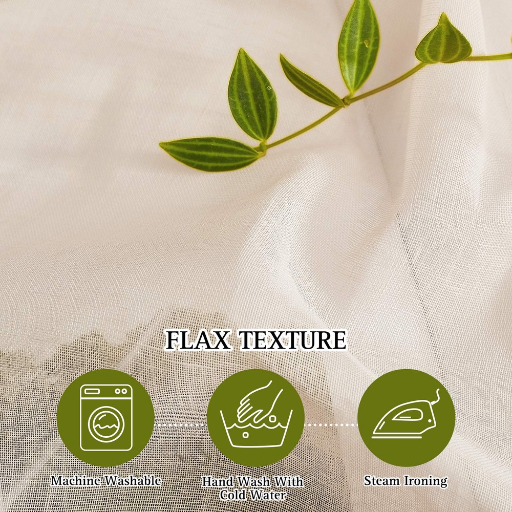 READY MADE: Package includes 2 flax sheer linen curtain panels, each measures 52"W (104"W for pair), with 8 (1.6" inner diameter) silver grommets to suit with standard or decorative curtain rod. LUXURY LINEN: The curtains adopt natural open linen weave flax sheer texture, with the linen blend, it looks more special and rich in an aesthetic feeling, perfect for vintage and casual style. SEMITRANSPARENT SHEER: With using the thick flax semi-sheer material, you will find the curtains will perfectly balance the light and privacy, create an airy and breathable space for your room. WIDELY TO USE: These linen sheer curtains are perfect choices for those who don't want others to see in. And this style will be suitable for any room as the fabric is versatile to go with any decor. EASY CARE: linen texture is wrinkle-free and has a good vertical sense for easy care. It's OK if you need tumble dry, quick ironing, steam clean or machine washable in cold water.