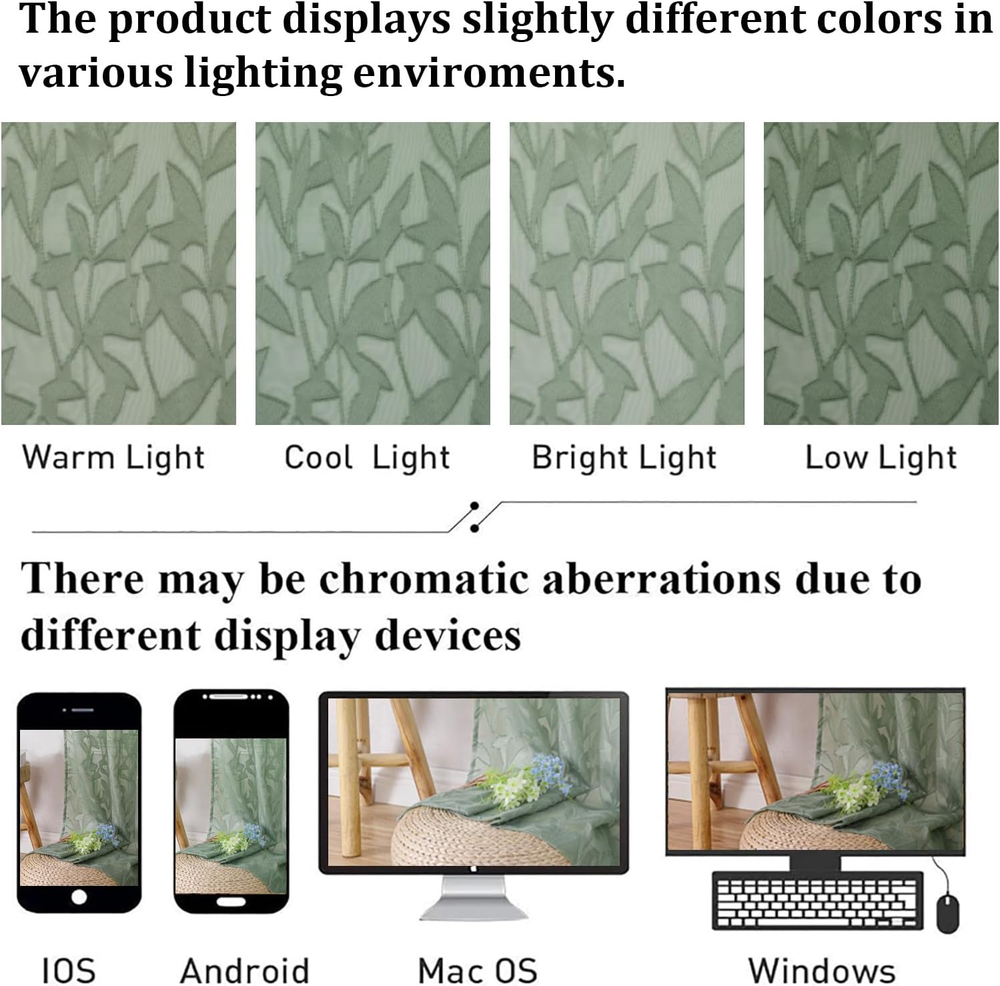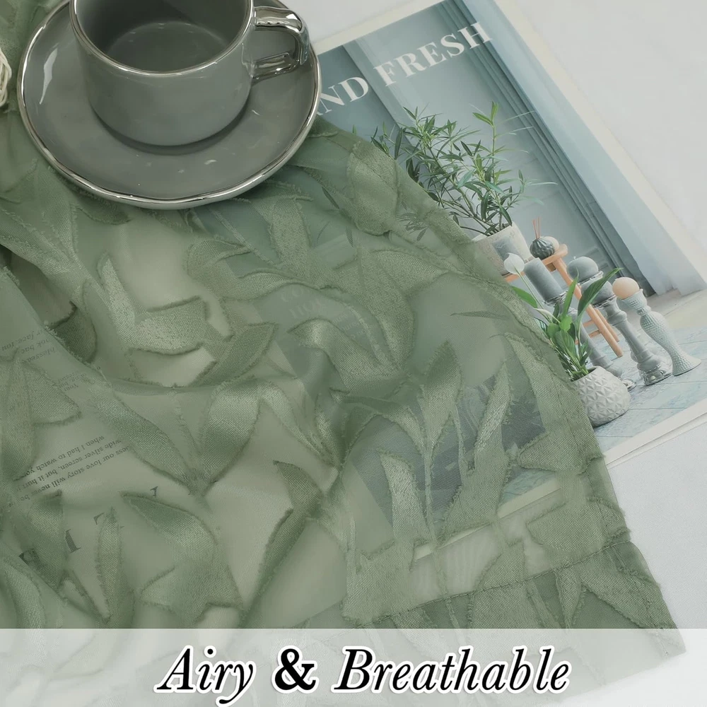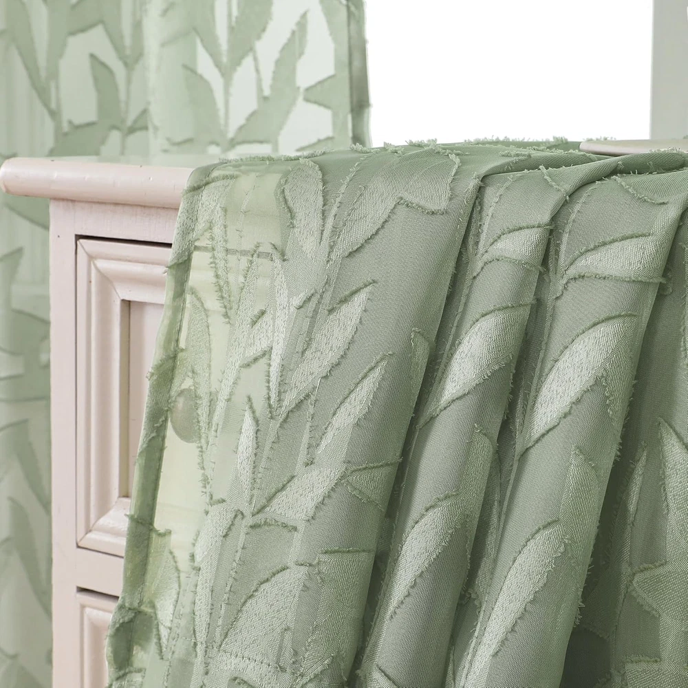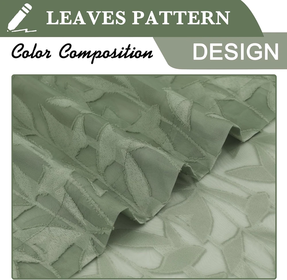Love these curtains! The soft sage green color adds a fresh, farmhouse vibe to my living room while still letting in gentle light. The leaf pattern is subtle but elegant, and the material feels high-quality for the price. They were easy to hang with the rod pockets and fit perfectly over my smaller windows. Great for anyone wanting a cozy yet airy look!