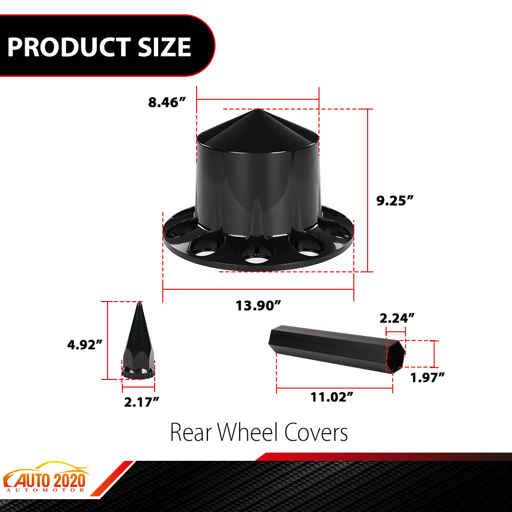 AUTOMOTO PRODUCT Fits Rear 33mm Nut Covers w/ Spiked Removable cap Semi Truck Hub Cover Wheel Set Product Introduction Title: Rear Wheel Covers Application: Fit For Semi-trucks 22.5" and 24.5" wheels Must have at least 3/4“of thread sticking out for lug covers to screw on Please confirm the item whether matches your vehicle in the compatibility table before purchase Description: 100% brand new and high quality Easy To Install and durable use. High Quality Materials and High Quality Product. Direct pricing by the factory, no price increase by the middleman. Limited life guarantee for workmanship and defects. No Installation Guide or Instruction Included. Color: Black, as the picture Warranty: 1 Year Quantity: 4 pc Material: ABS Plastic Package include: 4* Rear Wheel Covers ( If not shown in the photo, it is not included. ) Note: All of the items in our shop will come to you with the tracking number If any question, pls contact us on eBay freely, we'll reply you in 2 business day. Visit shop home WELCOME to our ebay shop CONTACT US We Open 7 Days A Week ABOUT US ABOUT US: Welcome to GPLUS's eBay Store. We specialize in aftermarket automotive car parts and is the #1 industry distributor for affordable and quality products. Welcome to GPLUS's eBay Store. We specialize in aftermarket automotive car parts and is the #1 industry distributor for affordable and quality products. Welcome to GPLUS's eBay Store. We specialize in aftermarket automotive car parts and is the #1 industry distributor for affordable and quality products. SHIPPING Shipping Information All items will ship within 24 hours (Monday - Friday). Payment cleared/received on Friday will be shipped on the next business days (Monday or Tuesday). We are not responsible for carrier transit time. This information is provided by the carrier and excludes weekends and holidays. Note that transit times may vary, particularly during peak periods or in climate weather conditions, and that delivery times frames will need to be extended for any processing time frames in excess of 1-2 business days. excess of 1-2 business days. International Shipping: International buyers are responsible for possible customs fees, brokerage fees or duty fees. We would appreciate for understanding of tracking number would not be updated in between the city of departing in the U.S. and the city of destination. ATTENTION Cargo transportation Double check shipping address. We are not responsible for incorrect or undeliverable addresses. Please use Shipping & Payments tab on top of page for shipping details for your location. Transaction will be held until a full shipping amount received. Shipping address Some of the packages cannot be delivered to a PO Box. Customer is responsible to ensure PO Box address given is deliverable by the shipping company. Package will be held until a valid physical address is provided. Customer assumes shipping charges incurred in shipping to undeliverable address. Customs duties International buyers are responsible for all customs duties, taxes, and other applicable fees incurred by the country's customs/border regulations. Please contact customs for more information. We are not responsible for any changes to address after item has been shipped. RETURN please notify us within 30 days after you've received your purchased item. Return Policy: Buyers pay for return shipping fee. Items to be returned must be in resalable condition.14 Days money back, please notify us within 14 days after you've received your purchased item. If your order has been received and it is not what you ordered, or if your item has a manufacturer defect, please contact us within 14 days from delivery date. And you must contact us to request an Return Merchandise Authorization Number (RMA). No return package will be accepted without a valid RMA number. All products are covered by our warranty against defects. EMAIL click here for questions All return requests must be submitted through your eBay account. Iterms and Condition For emissions related items, please check with your local jurisdiction for emission specific requirements before purchasing. All items do not come with installation instruction unless otherwise specified. If item is questionable, please consult your local professional/mechanic before making purchase.