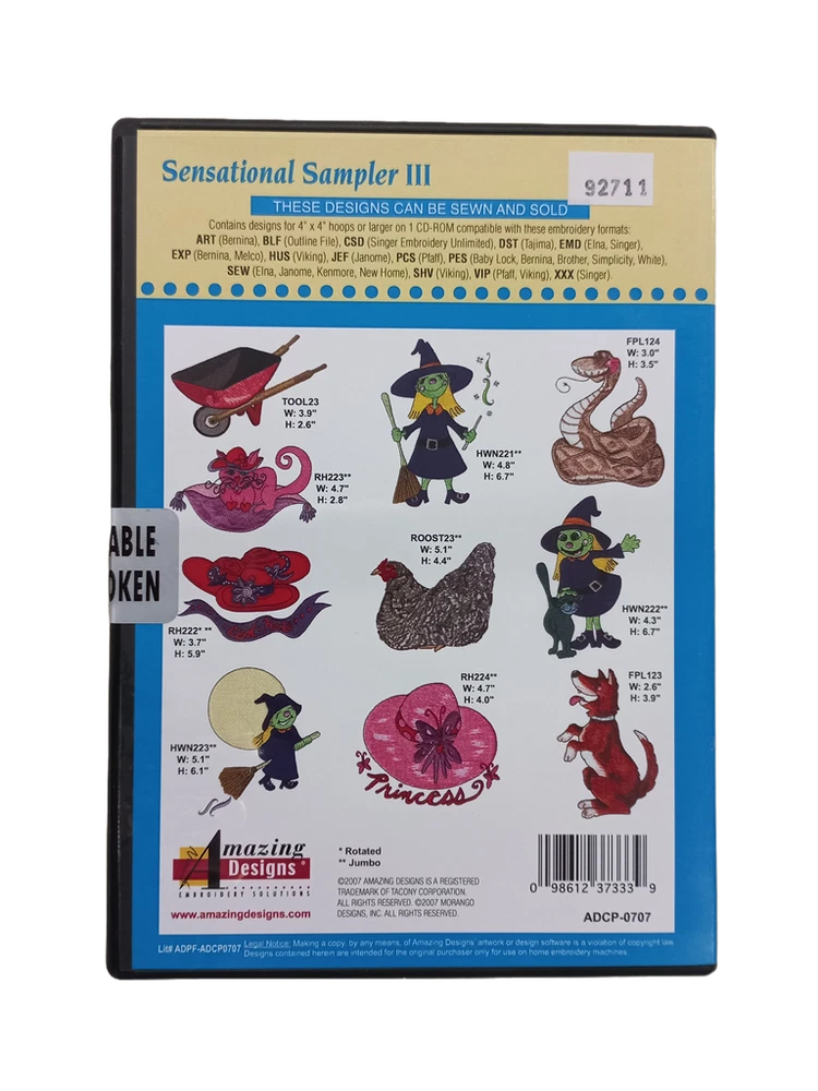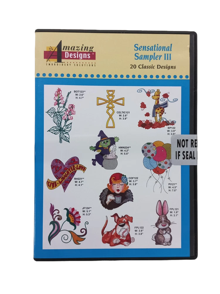 Sensational Sampler III - Amazing Designs - Machine Embroidery - CD # ADCP-0707 CD # ADCP-0707 - New, Sealed, Original Packaging 20 professionally digitized designs - Includes easy to follow color run information For 4" x 4" hoop sizes, or larger Compatible with : ART BKF DST EMD EXP HUS JEF PES SHV VIP XXX