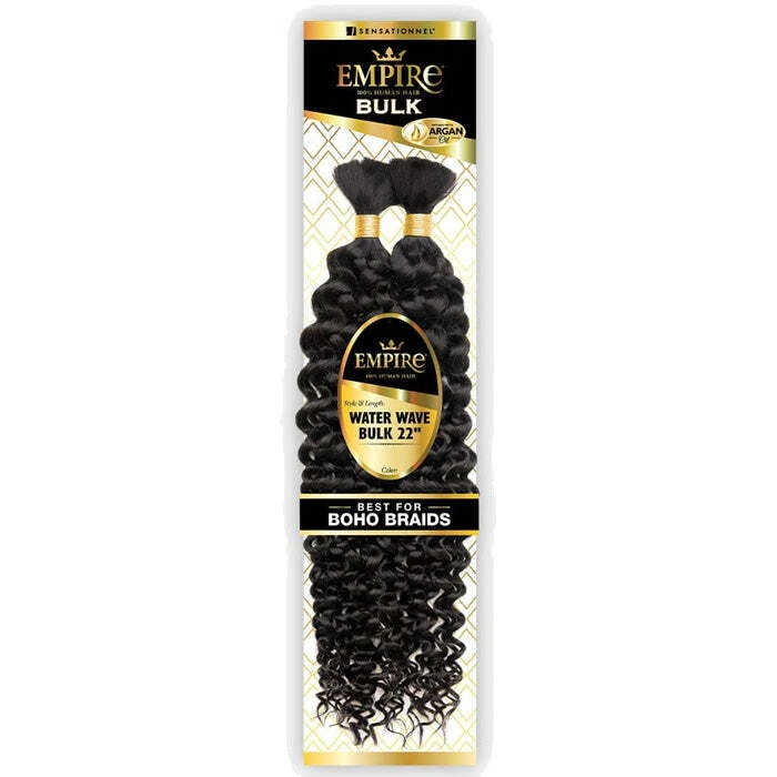 Sensationnel Empire Human Hair Braids - WATER WAVE BULK 18" / 22" BRAND: Sensationnel TYPE: Braids STYLE: Curly MATERIAL: 100% Human Hair LENGTH: 18"/ 22" HEAT RESISTANT: DYE/BLEACH/PERM: No SHOWN COLOR: 1 DESCRIPTION : The modern-day empress creates her empire. she's confident, she's bold, she's unapologetic, and she rules with vigor and grace. Crown yourself with EMPIRE®, and find yourself transformed to the upper echelons of power. Infused with nature's liquid gold, Argan Oil, EMPIRE® feels irresistibly soft with a radiant shine. Effortless and versatile to style, EMPIRE® empowers you to create every look you desire. Soft and Smooth Texture Tangle Free Argan Oil Infused 100% Human Hair The Hair That's Stunningly Soft and Smooth, Crown Yourself with Argan Oil Infused EMPIRE® - 100% Human Hair from SENSATIONNEL®. Argan Oil protects against the heat of hair dryers, curling irons, and flat irons; tames frizz and flyaways while maintaining a healthy shine. 100% HUMAN HAIR For Hair, That s Stunningly Soft and Smooth, Crown Yourself with Argan Oil Infused EMPIRE® 100% Human Hair BULK. Argan Oil protects against the heat of hair dryers, curling irons and flat irons; tames frizz, and flyaways, all the while maintaining a healthy shine. . . . . . . . . . . . . . . . . . . . . FEATURES : 100% HUMAN HAIR SOFT and SMOOTH TEXTURE INFUSED WITH ARGAN OIL LONG LASTING and TANGLE FREE CURLS