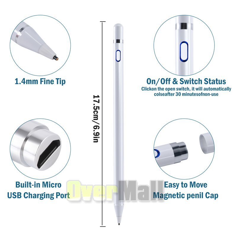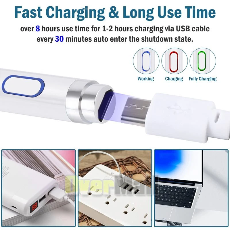Lápiz capacitivo de alta sensibilidad para tabletas iPhone iPad Pro Android BEST CUSTOMER SERVICE ON OUR sale2015express EBAY STORE↓ ↓ ↓ 〓SHIP From US Local Stock 〓FAST & Free, 1-6 Days Arrival 〓FREE Return, Seller Pay!! 〓QUICKLY Reply within 24 Working Hours 〓 MOST orders ship within 1 business day with Tracking Number 〓 ANY PROBLEM please email us before feedback, thanks! Add our listing to Watchlist Or Add to Cart , you will get more discount!!! Feature: 1. Continuous use up to 8-10 hours, 30 minutes without use will automatically power off, three-color LED lights indicate activity, charging or fully charged. 2. Stylish and simple style, aluminum alloy material and painting process, the pen tip is made of special conductive material, precision grinding, which can prevent damage to the screen. 3. The stylus is sensitive to pressure and tilt, so you can easily change line thickness, create subtle shadows, and produce various artistic effects. 4. This stylus adopts the latest technology to ensure that it is widely compatible with all touch screen products, suitable for most mobile phones, tablets, capacitive screens and other electronic devices. Specification: Model: 2262 Material: aluminum alloy Process: painting, electroplating Input: 5V-0.2A Applicable models: Universal (Apple and Android) Battery: 100mAh Charging time: 50 minutes Working time: 8-10 hours Charging time: 50 minutes Working time: 8-10 hours Charging interface: Micro charging interface Product size: 175 (length)*8.9 (diameter) mm/6.9*0.35inch Color box size: 21*6.1*2.1cm/8.3*2.4*0.83inch Compatibility with: All touch screen device, iPhones, iPads, iPods, Android Phones, Android Tablets, Windows Tablets, PC,iPad, iPod, Kindles, kindle fire, Nooks, samsung galaxy phones, tablets and smart phones. etc. For iPhone 12 / 12 mini / 12 Pro / 12 Pro Max / iPhone SE (2nd generation) /11 / 11 Pro / 11 Pro Max / XS / XS Max / XR / X / 8 Plus / 8/7 Plus/7/6 Plus/6/5; For Samsung Galaxy Note 20 / Note 20 Ultra / Note 10 / Note 10+/Note 9/Note 8/S10 / S10 + / 10e / S9 / S9 Plus etc. For Huawei Mate Mate 20 Pro / P30 Pro/Mate 30/Mate 30 Pro/P40/Mate 40 Pro/P20/P30,etc. Package includes: 1x Stylus 1x Manual 1x Micro Charging Cable 1x Pen Cap