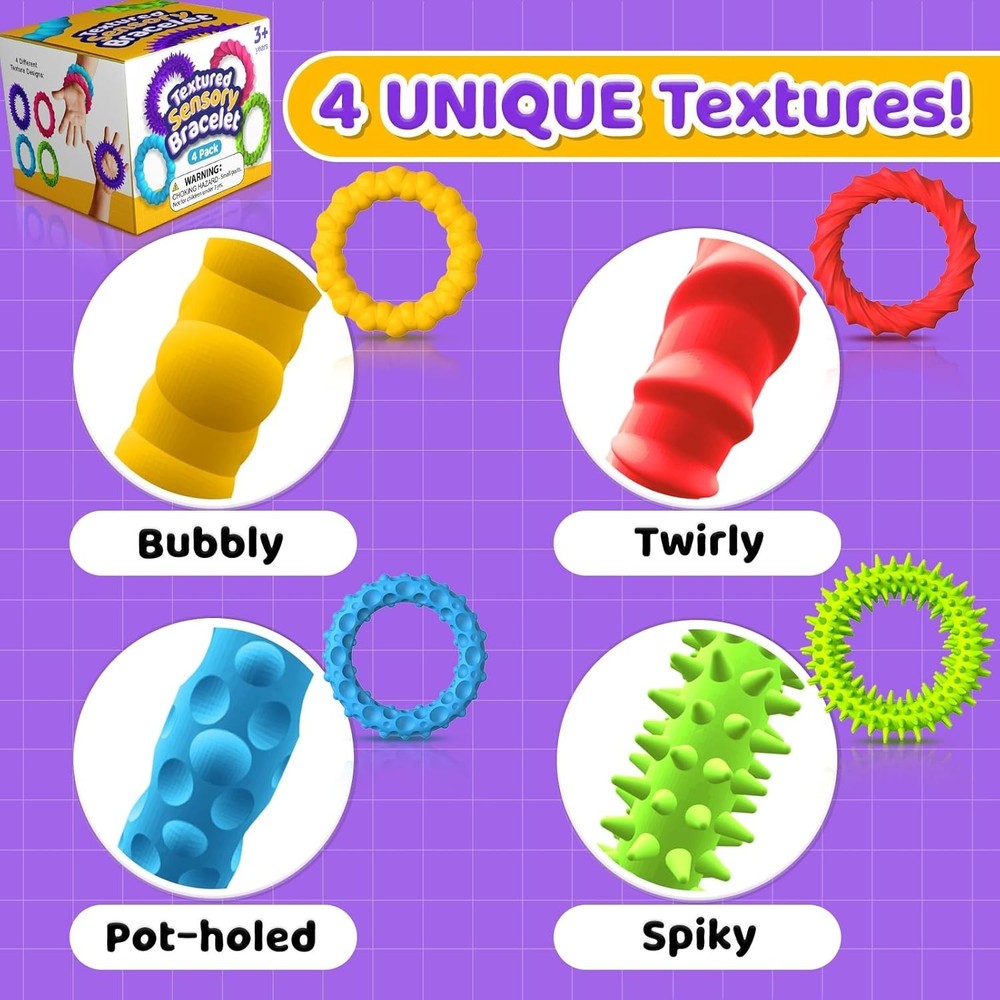 【4 Pack Fidget Bracelet】 Our 4 pack sensory textured bracelets are fidget toys that can be worn on the wrist, perfect stress relief toy for toddlers, kids, teens, and adults. Each fidget bracelet comes in a different vibrant color and features a unique texture, providing a satisfying sensory experience 【Stretchy Sensory Toys】 Made from high-quality, stretchy rubber material, these bracelets are durable and can be stretched and pulled without losing their shape. They are also safe and gentle on the skin, offering endless hours of tactile fun. We can play this fidget toys with children with complete confidence, it will not cause any harm to children, because it is very soft and feels comfortable 【 Calm Down Tool】 The textured sensory fidget toys are a must-have for anyone seeking a fun. Especially meet the special needs of children with autism, these fidget bracelets provide a calming effect and help promote focus and relaxation 【Suitable for Any Occasion】Boys and girls can easily put stretchy sensory bracelets on their wrists and take them to school, on a road trip, or outdoors to play with their friends. With unique textures, bright colors, and super stretchable material, they provide hours of endless entertainment 【Party Favor & Great Gifts】 Perfect fidget bracelet can be used as gift treasure box toys for children, carnival games prizes, birthday gifts, school classroom prizes, candy bags pinata stuffing, student rewards from teachers! And helps calm the child's nerves and helps them focus on something fun and enjoyable to work through. Idea christmas stocking stuffers, easter basket filler