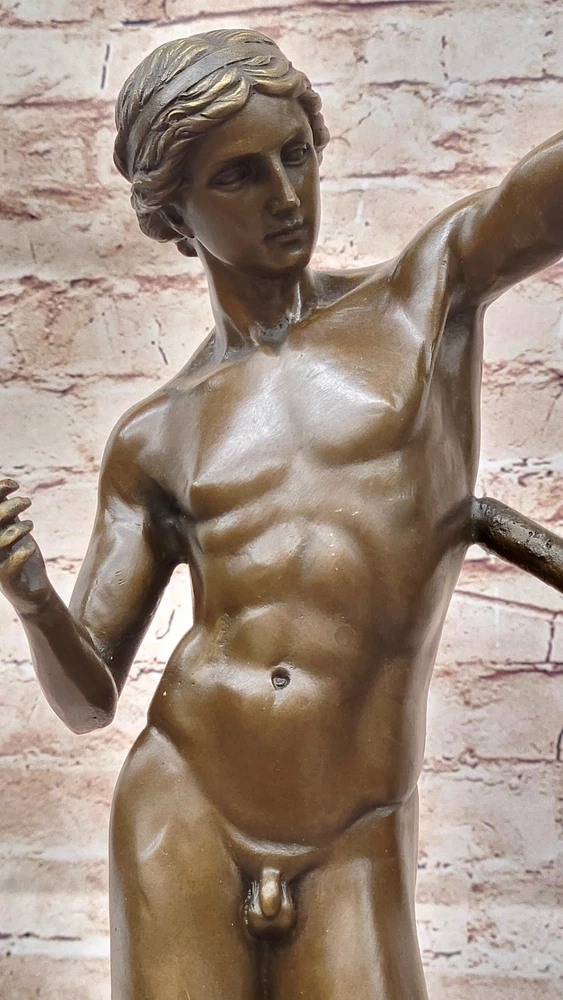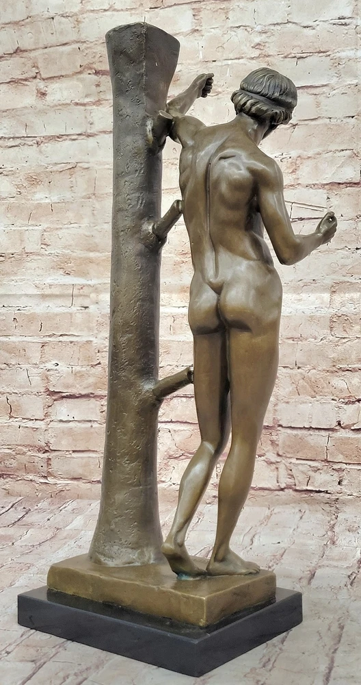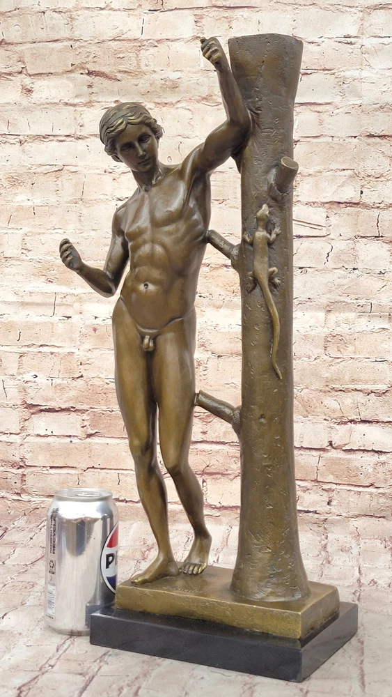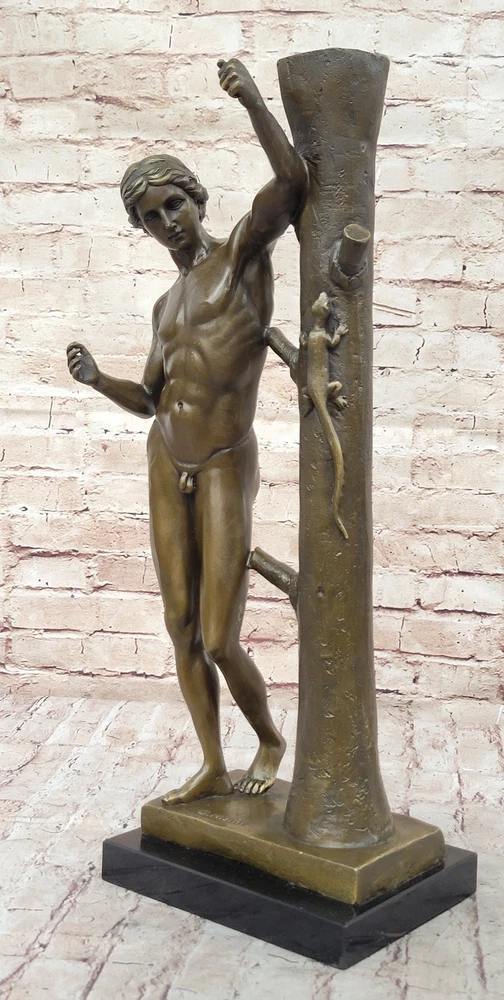 Sensual Male Nude Greek God Collector Lizard Bronze Marble Statue Sculpture Gift Sensual Male Nude Greek God Collector Lizard Bronze Marble Statue Sculpture Gift Condition : This sculpture is in perfect condition. Bronze Dimensions with Marble Base: Height 21" X Width 9" Marble Dimensions:8" X 5" Height without base:20" Weight:18 LBS Inventory:44Y1968444 Mesmerizing Moment in Nature Transport yourself to the tranquility of a wooded garden with this mesmerizing bronze sculpture. Here, in the heart of nature, a nude male figure takes a leisurely stroll, his attention captivated by a lizard gracefully making its way up a tree. Enthralled by the lizard's graceful ascent, he pauses, resting his left forearm against the tree trunk, his gaze locked on the reptile's elegant climb towards the canopy above. Masterful Craftsmanship Crafted with meticulous precision, this bronze sculpture embodies the time-honored technique of lost-wax casting, ensuring that every intricate detail is faithfully preserved, guaranteeing its enduring beauty. Enhanced with a lustrous brown patina finish, it exudes an ageless charm that transcends time. Poised atop an elegant black marble base, this masterpiece bears the unmistakable signature of the renowned artist G. Nisini. Harmony and Serenity Let this enchanting sculpture introduce the wonders of the natural world into your surroundings, encapsulating a moment of profound curiosity and harmony between humanity and nature. Whether displayed in your home or office, it serves as a tangible reminder of the serenity and magic found in the unspoiled beauty of the great outdoors. G. NISINI NUDE MALE LEANING AGAINST TREE BRONZE STATUE SCULPTURE FIGURINE DECOR www.bronzhaus.com Video will open in a new window Using the eBay App? Paste link into a browser window: [isdntekvideo] Shipping Terms : Most of our items are shipped via USPS (United States Postal Service) mail or UPS. Most orders are shipped within 24-48 hours of purchase. Please be aware that not all items are available for USPS shipping due to size and weight. We do ship to Hawaii, Alaska, Canada, Puerto Rico, APO/AE, and U.S. Virgin Islands, however, an additional charge may be required. Please contact us before making any purchases in these areas. For Non-USA customers, you may be responsible for all duty, tax, brokerage fees that may be due upon delivery (shipping costs cover freight charges only). We also ship internationally. Please refer to the "Shipping and Handling" chart for the rates for each area. Payment : We accept just about any form of payment. PayPal, Master Card, Visa or American Express credit cards. Money orders, cashiers checks, and even personal or business checks. For governmental institutions, we will also accept a purchase order. Please understand that for personal or business checks we have to wait for the check to clear (usually 7 days) before shipping. Condition : New Detailed Hand Crafted Hot Cast Bronze Satisfaction Guaranteed. This is Stock Photo, Slight Color Variation!! Listing and template services provided by inkFrog
