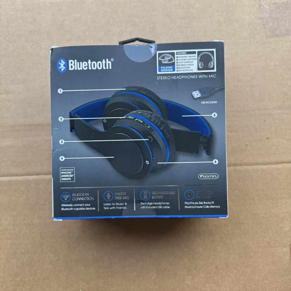 The Sentry BT202 Bluetooth Stereo Wireless Headphones feature a foldable headband design in blue and black colors. They offer a double earpiece with built-in microphone, noise cancellation, adjustable headband, and volume control. These headphones are compatible with both iPhone and Android devices, allowing you to answer phone calls wirelessly. The rechargeable design includes Bluetooth, USB, and 3.5mm jack connectivity options for versatile usage. Shipped with USPS Ground Advantage.