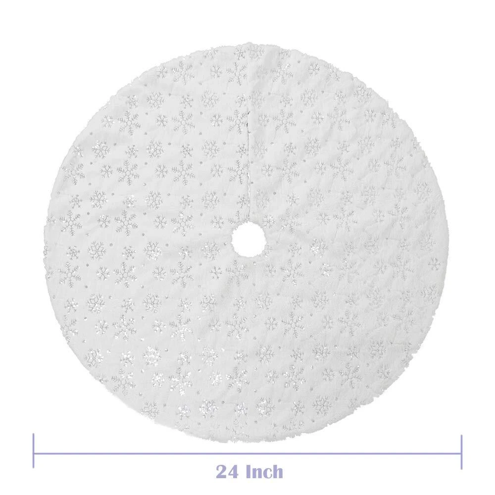 The gorgeous tree skirt is designed with a hand-made silver snowflake. No tree is complete without a beautiful tree skirt. This Christmas tree skirt fits any size tree and drapes nicely over your tree stand. This evocative tree skirt captures the of Christmas Eve. White plush and silver snowflakes form a perfect Christmas scene. The skirt creates a warm and soft feel, perfect for any cozy Christmas theme. This tree skirt features a white background accented with snowflakes of different sizes that accent the entire tree skirt. Material: Double Layers (Front is White Faux Fur; Back is Polyester) Diameter: 24 Inches; 32 Inches; 48 Inches Design: White Faux Fur Sequin Snowflakes Soft and Warm Double Layers It made with white faux fur for a warm look and feel. Double Layers. Three tapes closures round this piece out with a handy touch for keeping your tree wrapped up. This tree skirt has an allover design with sequin snowflakes adornments for an extra festive touch. Add the perfect finishing touch to your Christmas tree with this tree skirt with sequin snowflakes. Add this traditional Christmas tree skirt to your decor to add a splash of beauty to your home.Its sequin design is accented with snowflake appliques for a festive touch. Our cozy plush tree skirt is a simple and festive way to dress up a tree and protect floors from fallen needles. Bring the tasteful holiday look with this faux fur luxury christmas tree skirt. This tree skirt is jolly, merry, festive, joyful, and full of Christmas cheer. A timeless and fun design that you will cherish as part of your Christmas decorations.