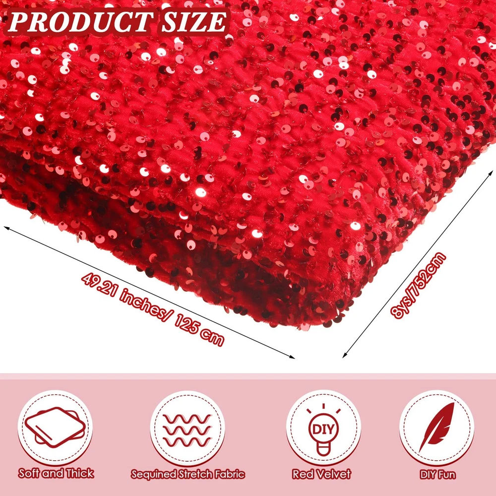 Features: Attractive and eye catching: The birthday table runner is featured with refined workmanship, which can attract your guests' attention and get their appreciation. Funny gift: The table runner for wedding reception can be sent to your family members, close friend, neighbors who want to prepare for happy and pleasant activities. Specifications: Material: polyester fabric Color: red Size: 8 yd/ 732 cm x 49.21 inches/ 125 cm (L x W) Package includes: 1 x Tablecloth Notes: Manual measurement, please allow slight errors on size. The color may exist a slight difference due to different screen displays. Small parts included, please keep away from children. Our product is not suitable for sensitive skin. Test whether there is any allergy on a small part of your skin before use. Please stop applying if there is any discomfort, and please be careful to gently remove the product to avoid skin injury. Trustworthy Quality for You: the glitter tablecloth is made of quality polyester fabric; You can use it as your own sewing craft for home and party decoration Size Information: the velvet sequin fabric measures 8 yd/ 732 cm x 49.21 inches/ 125 cm (L x W); You will receive 1 individual pieces of fancy tablecloth, which is good for party decor and craft projects from doll clothes to home decor Stylish Design: the red table fabric can provide you with inspiration and desire for DIY work; The red tablecloth for rectangle tables is easy to cut and sew, meeting your diverse needs Easy to Care for: the sequin fabric by the yard can be hand washed in cold water, which is reliable and reusable, necessary for anyone who wants to do DIY and other decorative activities Versatile Application: the sequin fabric by the yard can be applied for most items, suitable for stockings, purses, pillows, dresses, costumes, skirts, bags, school projects, tree skirts, tablecloths, backdrops, table flags and so on