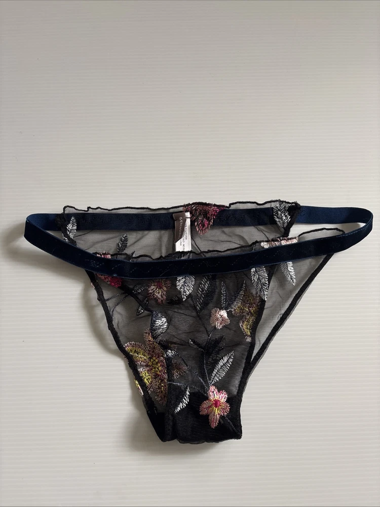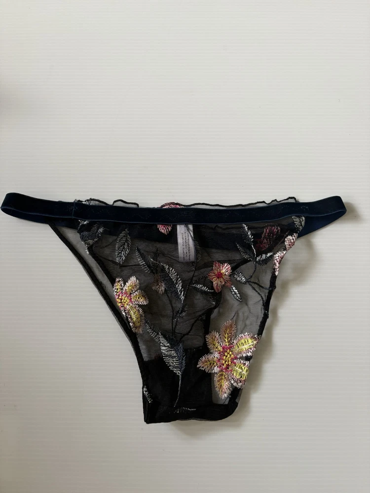 Serendipity presents a size 2 black thong with floral embroidery on mesh fabric. This women's panty features a thong/string style with a flower theme, offering stretch and breathability for comfort. Perfect for those who appreciate delicate accents in their intimates.