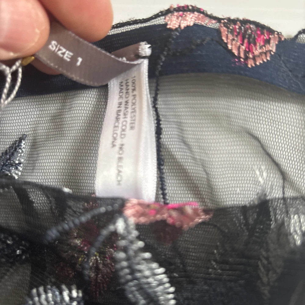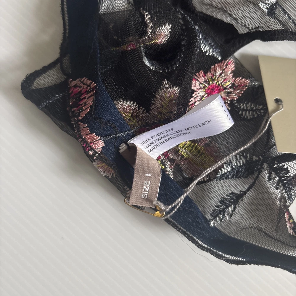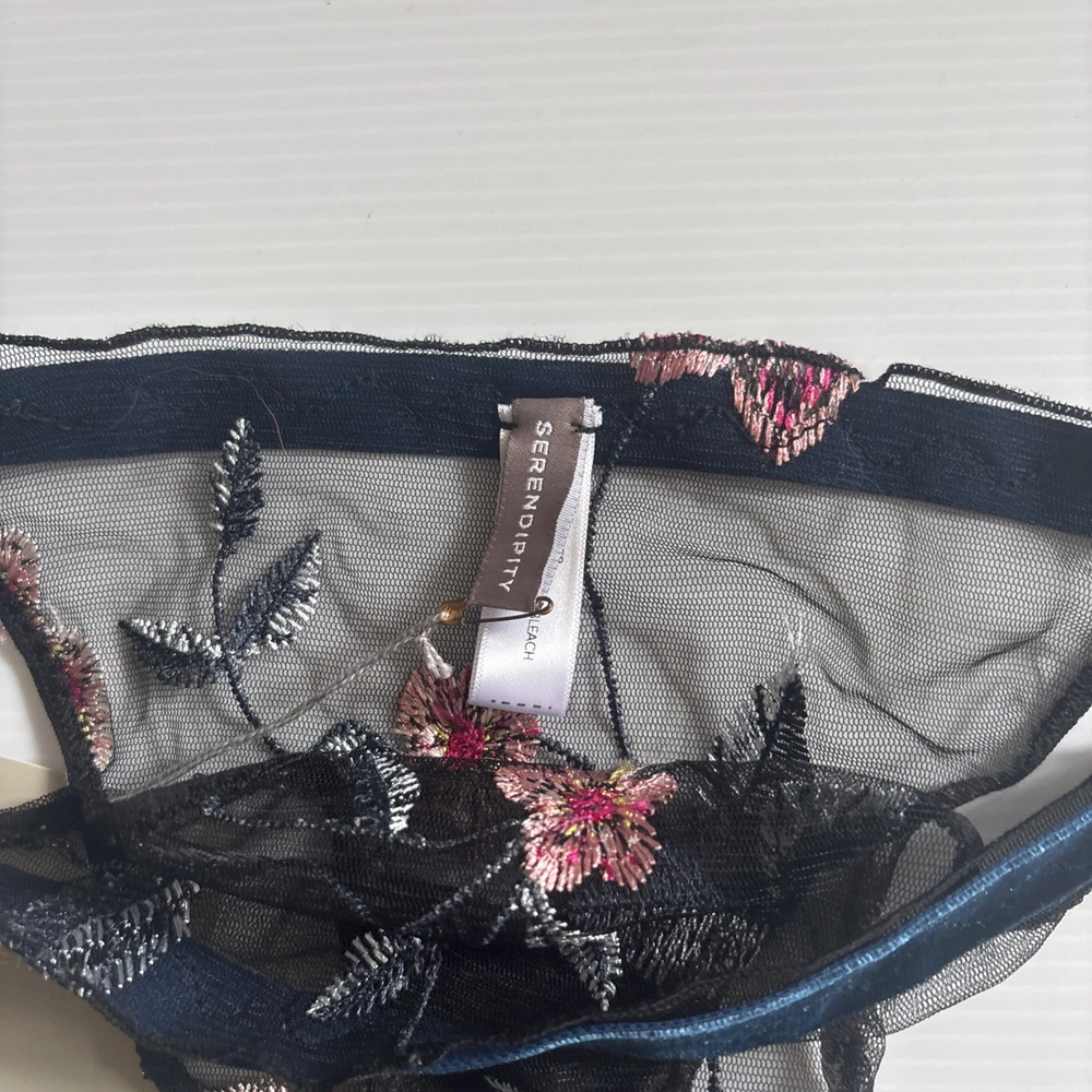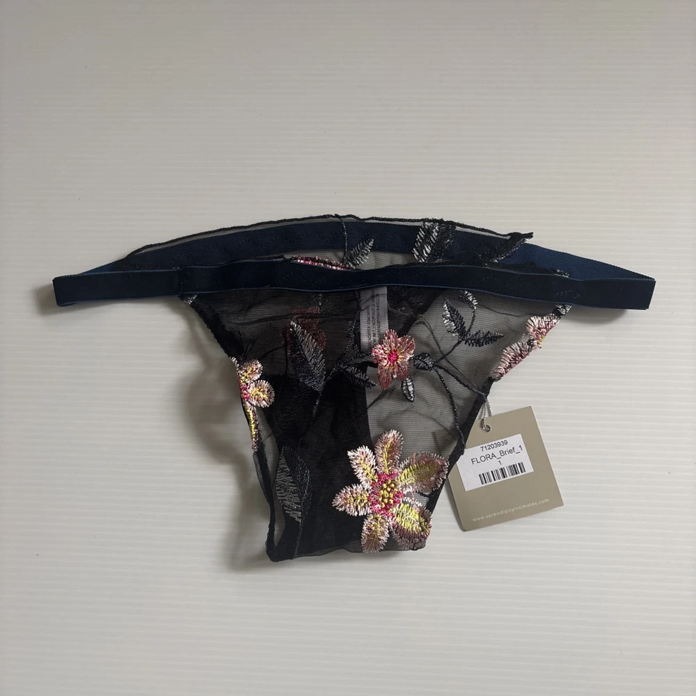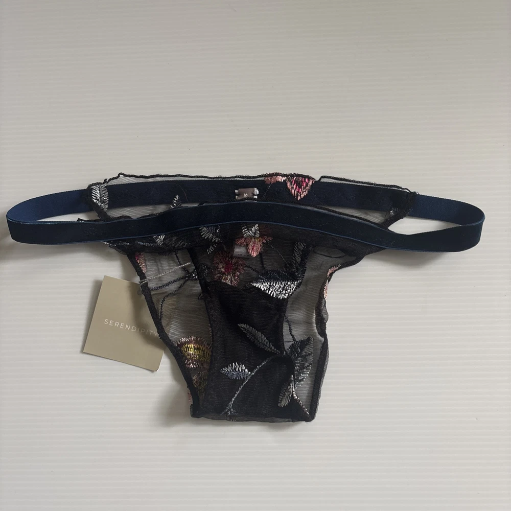 Serendipity presents a size 2 black thong with floral embroidery on mesh fabric. This women's panty features a thong/string style with a flower theme, offering stretch and breathability for comfort. Perfect for those who appreciate delicate accents in their intimates.