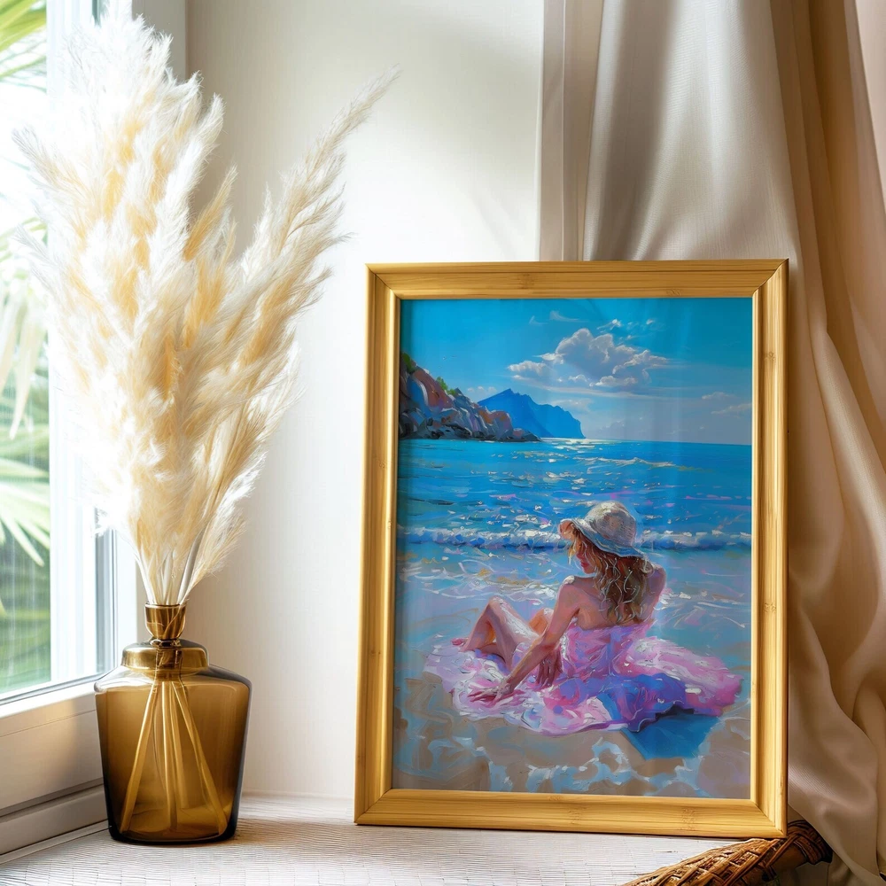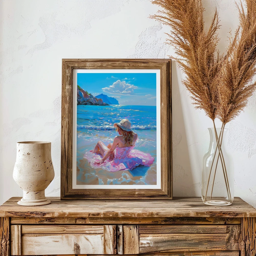 Serene Beach Scene With Woman In Hat Coastal Art Print Ocean View Wall Decor Summer Beach Art Material: Premium luster photo paper Print type: Inkjet printing One side printed + The finish provides the highest possible resolution and color saturation + Lasts up to 200 years in color and 400 years in black-and-white + Printed on high-quality resin-coated photo base paper medium + Posters can be hung with double-sided tape, tacks, or framed + Hand washing with a gentle cry cloth is recommended for extended durability I will hand select the best choice of paper for your chosen design to ensure top quality results for a beautiful, bright and luxurious print. All prints are sealed in cellophane slips for protection during transportation, and are shipped in a protective cardboard envelope.
