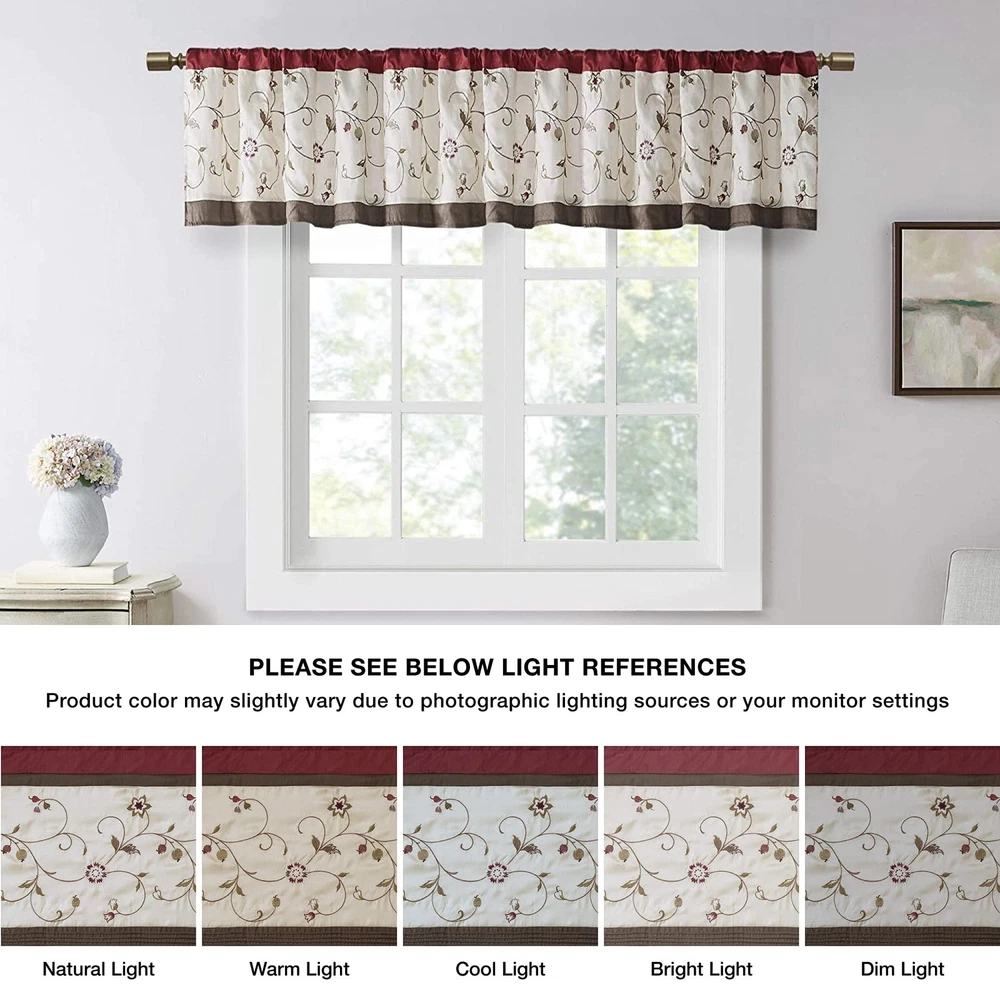 Set Includes: 1 Window Valance This valance features delicate floral embroidery in rust spice and neutral hues, offering beautiful contrast for a sophisticated look. The pieced and pleated details provide extra dimension and charm to your home decor, while added lining helps filter the perfect amount of sunlight into your home. Simply hang on 3" rod pocket, fits up to a 1. 25" diameter rod. Care Instructions: Machine Washable