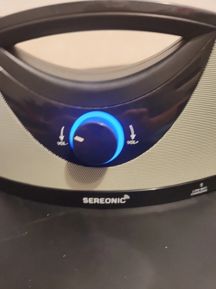 The product is a Serene Innovations Sereonic Replacement Speaker for the BT-200 model. It is a rectangular-shaped smart speaker in gray color with wireless and wired connectivity options. Please note that the base is not included with this speaker.
